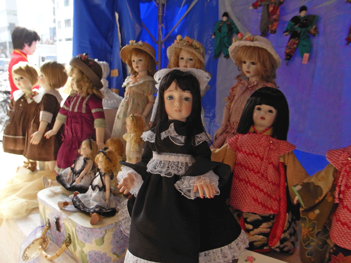 日本橋での3日間にわたる「人形市」、最終日は雨ながら無事終りました。この写真の私の作品は一番前の黒いドレスの子だけで、後ろに並んでいる子達は友人の作品です。販売もしますが、「持っていった作品の中の4体ほどは、銀座での作品展に出品しよう・・・」と思っている私からは、「売りたい・・・」という気が全然出ていなかったようで(これは来てくださった里山さんの感想でもあります)、小物販売(古布や着物生地)だけの売り上げでした。友人の作品は数体売れました。私の作品は、どうも個性が強すぎるようです・・・。来年も参加できるとしたら、コンセプトをきっちりと考えていかなければなりません。でも、創るということに重きを置いているためか・・・はたまた商売の資質がないのか、販売員には向かないようです。一応笑顔で接客するのですが。自分で思うに、職人気質なのではないかと・・(逃げているかしら)。来週からの銀座での展示会が終ったら、ちょっとゆっくりしたいと思っていますが、貧乏性ですので、それがどこまで続くか・・・。今度は猫を創りたいと考えています。