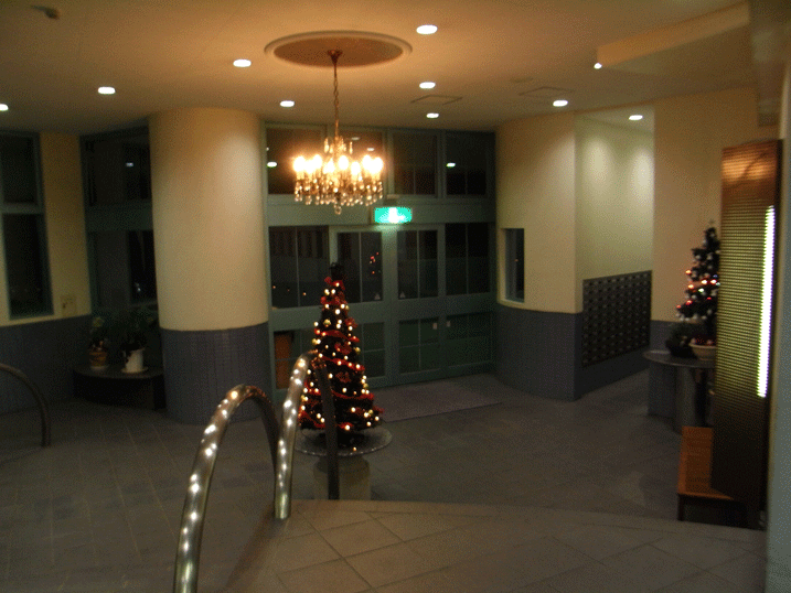 我が集合住宅のエントランスです。疲れて帰ってきたら、早朝の活花がクリスマスツリーに変わっていました。ただそれだけの事なのに、胸の奥がホンワカと暖かくなったのです。そして、なぜか「マッチ売りの少女」を思い出して、今度はジーンと切なくなってきました。この場所は声が響くので、ステージにもいいみたい・・・なんて思うのは私だけだと思います。なんてことない風景に心が反応しました。