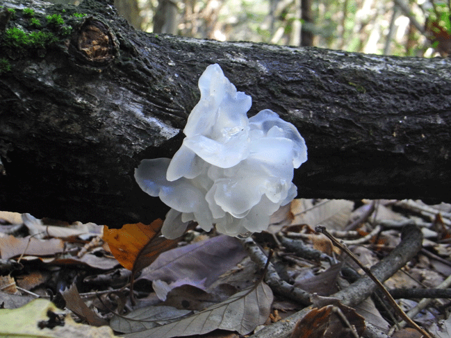 昨日は「雲の上のきのこの会」の忘年会。菌の繋がりは深くて、遠い所からモモクリさんもいらしてくださいました。他の会合だと「なにそれ!」と言われるような、きのこの話、釣りの話で盛り上がり、時間は瞬く間に過ぎていきました。コメツガさんからカレンダーを分けていただき、ココママさんからは「山葡萄ジャム」のプレゼントがありました。コメツガさん、ココママさんありがとうございます。そして、美味しい料理のお店の手配をしてくださった里山さん、二次会カラオケ担当のジョンリーさん、ありがとうございました。ということで、深夜に帰ってきましたが、今朝の天気は快晴。コメツガさんにナラタケが出ていると聞いていましたので、またぞろ里山へ行きました。最初に見つけたのは、降り続いた雨をたっぷり含んだシロキクラゲ。透明で柔らかそう・・・見たとたんに、今夜は中華炒め・・と決まりました。雨が多いと、キクラゲ科のきのこが多く目に付きます。手のひらを広げた大きさのハナビラニカワタケです。先のシロキクラゲと一緒に料理しようと写真の後収穫しようとしましたら、ほろりと崩れてしまいそうでしたので、そのまま置いてきました。まるで帽子につける飾りのように立派でした。晩秋まで楽しめるクリタケ。収穫ギリギリセーフという感じで、籠の中に納まってもらいました。たぶん数年前に棄てられたであろうシイタケのホダ木から出た、名残シイタケ。採るには早かったのですが、「美味しく食べてあげるね」と諭して連れ帰りました。春から初夏にかけて様々な山野草が見られる里山。今年の春に写真におさめていた「シュンラン」の株に種が出来ていました。長く山歩きしていますが、種を見たのは初めてです。花や株は持ち帰りませんが、今回は種を頂いてきました。実生から育てて、何年したら花が咲くのでしょうか。完全に乾燥したら、ガーデニングを趣味にしている妹に託して、種蒔きしてもらいましょう。お目当てのきのこはナラタケとムラサキシメジでしたが、一本も見つかりませんでした。でも、雨上がりの土から立ちのぼる香りは、甘い枯葉の匂いを含んでいて、コナラやクヌギの紅葉と樅の木の緑のコントラストも美しく、今日も自然の中で遊ぶことができました。勿論、シロキクラゲとシイタケは、中華炒めとホイル焼きにしていただきました。ごちそうさまでした・・・。