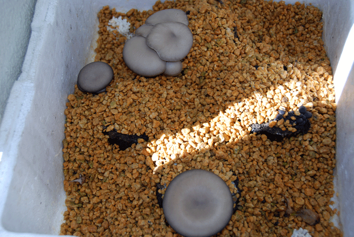 何の気配も無かったベランダのヒラタケホダ木に、やっとヒラタケが発生しました。真ん中右側のホダ木にも小さい菌が出始めています。100パーセントの発生でした・・バンザイ~~夏の日差しがあたったり、水分が切れて乾いてしまったりしましたが、ヒラタケ菌って案外強いようです。これで念願のヒラタケステーキができます。ホダ木自体が細いので2回目の発生は望み薄ですが、こんな過酷な環境のベランダでヒラタケ栽培ができると分かっただけで満足です。おまけの写真・・・。先日公園で採ったクリタケと、里山さんに頂いていた塩蔵ワラビを使った「混ぜ込みご飯」です。鶏肉と油揚げも入っています。春と秋が入っている贅沢ご飯でもあります。ワラビを入れたら、味が決まりました。一切れだけ載っているムラサキシメジがアクセントですが、小さくて分かるかしら・・・。実りの秋、あるいは新芽が萌え出る頃、魚が美味しくなる頃・・と仲間の皆様に温かいプレゼントを頂いて、ほんとに感謝しております。おかげさまで、季節感溢れる食卓を囲むことができます。