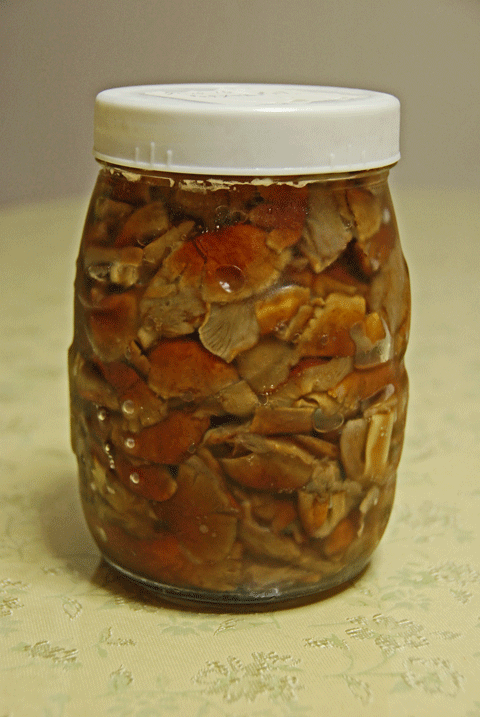 前回の保存きのこの続きです。採れるきのこの種類がそろそろ少なくなってくる晩秋。御山の早朝は吐く息が白く見えて、標高が高い所には霜がおりている頃です。そんな中「きのこのシーズンも終ってしまうなぁ~寂しい・・・」と思いながら、昨年コツコツ集めたチャナメツムタケ。すき焼きに入れたり、大根おろしと和えたり、お味噌汁に入れたりして一通り楽しんでから、残りはこのように瓶詰めして保存しておりました。瓶の高さ18センチで、結構な量が入っています。見て分かるとおり、全部が半割りになっているのは、虫入りじゃないかどうか?の確認をしたからです。さっと茹でて、バットに広げた塩の中で全体に塩をまぶしてから瓶に詰めていきました。最初は白く見えていた塩も、二日ほどしたら融けてしまい、見た目は水煮のようです。ハルシメジが採れる季節を前にして、そろそろ食べてしまわないといけないのですが、冷凍きのこと違い、御山に気持を馳せながらしみじみ眺めるという楽しみかたがあるので、なかなか調理できません。さて、いつ食べましょう。。。