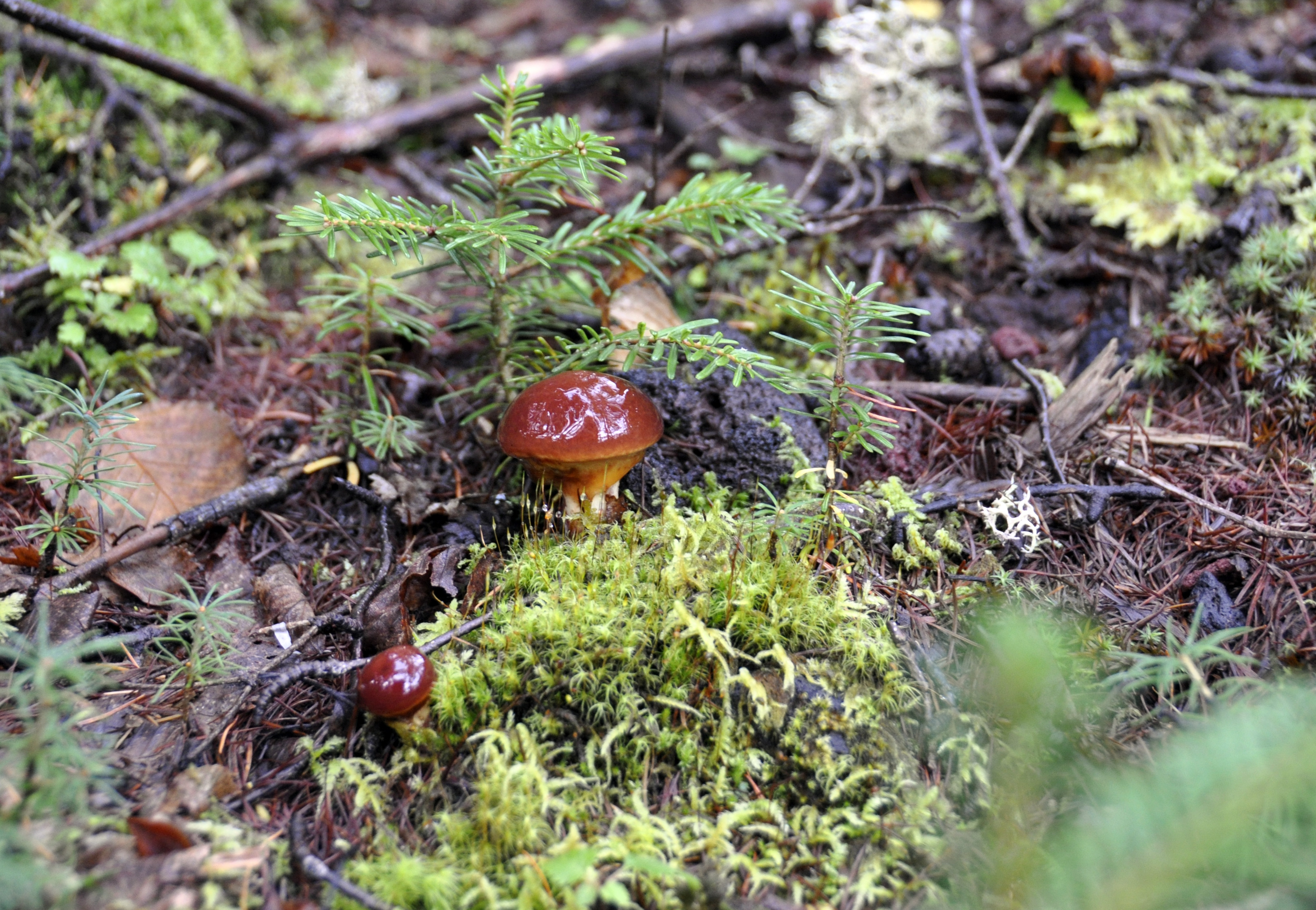 苔の中のハナイグチは明るい色合い、ガレ場に出る幼菌は石ころに似た暗赤色。