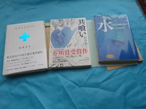 最近 秋の訪れで、夕方に成るとツルベ落としと言うか、4時を回ると 当たりがうす暗くなります。区の”子供は気を付けて、お家に帰りましょう” のアナウスも、5時30分~4時30分に早まりました。 いよいよ 秋の夜長が始まりました。読書の秋ですね! 自分は、余り小説、時代の物 文章が多い物は苦手です。 でも 全く嫌いではないのかも知れません。春にこの本を買いました。 右は、水に関する いのちと健康の科学 と言う、ビジネス書です。 科学的なことで、とてもむずかしくて要所だけ、読み、物事が起きた時 あさって、見て居ます。 あと2冊は、全国的に知られて居ますので、言うまでも有りません。 ” 共食い ”は 意外な感じでした。 最近 心に残った本?て言われたら” KAGEROU ”です。 前から 移植とか、ドナー登録に関心が有りましたので、多々心に 突き刺さる物が有りました。時代性も感じました。