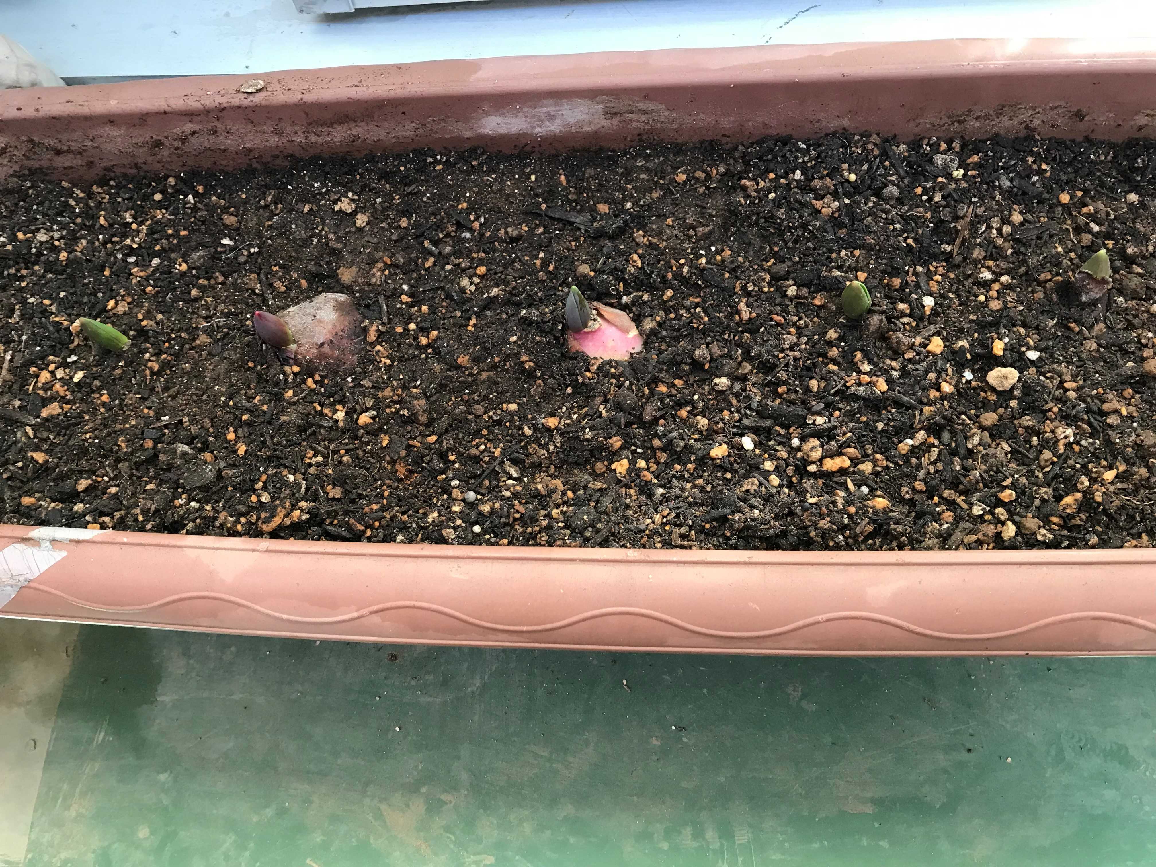 昨年10月にチューリップの球根を植え付け置いたら芽が出てきました。