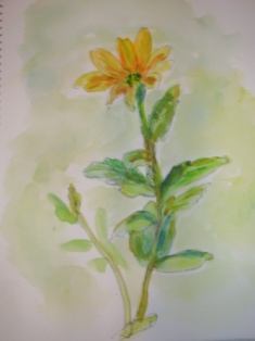 久しぶりに水彩画を描きました。夏休みの宿題に取り掛かろうとしている(って、もうじき終わりなのに)二男がきっかけでした。「おかーさん、ポスターと絵とどっちにしたらいい?」「お母さんなら、絵」「じゃあ、ポスターにしよ。」どーいうこと?交通安全のポスターは、いろいろと基準があるので、(シートベルトを正しく装着している絵でないとだめとか)ちょっとたいへんなことを伝えると、絵ということになりました。絵は、「わたしのすきなふるさとの景色」という題材です。どこかいきたかったけど、うちの庭にしました。私も、横で描きました。油絵に比べて、直しがきかないので、難しい気がしました。でも、油絵よりも気軽に描けるので、ちょっと、絵でも・・・なんて、スケッチが趣味になるといいなあ~~