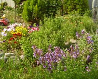 トップページに「花が満開です。見に来てね~」なんて書き加えたら・・・それは全然関係ないと思うんだけど、今日、今年初めての「オープンガーデン」のお客様が来ました!わお!でも、「6月から」ってパンプレットに載せたので、ちょっと不意打ちでした。まだまだ草だらけ~~10のうち8が草~、1が花~、後の1は石~なんて、笑っているような庭なのに、パンプレットを持った来客が5~6人で庭を見ているではないですか!ひえー!どんどん入ってくるぞ~私は、こそこそと隠れながら草をとっていました。でも、私の近くまで来て、「こんにちは。」をいわずにはいられないほど接近してきました。わたし「どちらからですか?」お客 「東京からです。こちらは篠ノ井(隣の市)の方。」わたし「そうですか~。遠くからありがとうございます。まだまだ、草だらけで、がんばっているとこなんですが。昼間は働いているんでなかなか(言い訳)」お客 「そうなんですか。広いですもんね。」お客 「3年後ぐらいが楽しみですね。」と、励まされました!!そのあと、せっせと草をとり、くわを持ち、土を耕し苗を植えるスタンバイしました。やっぱ、まだまだオープンガーデンなんてしなきゃよかったかな~(3年になるけど・・・)庭の西側から見た感じ