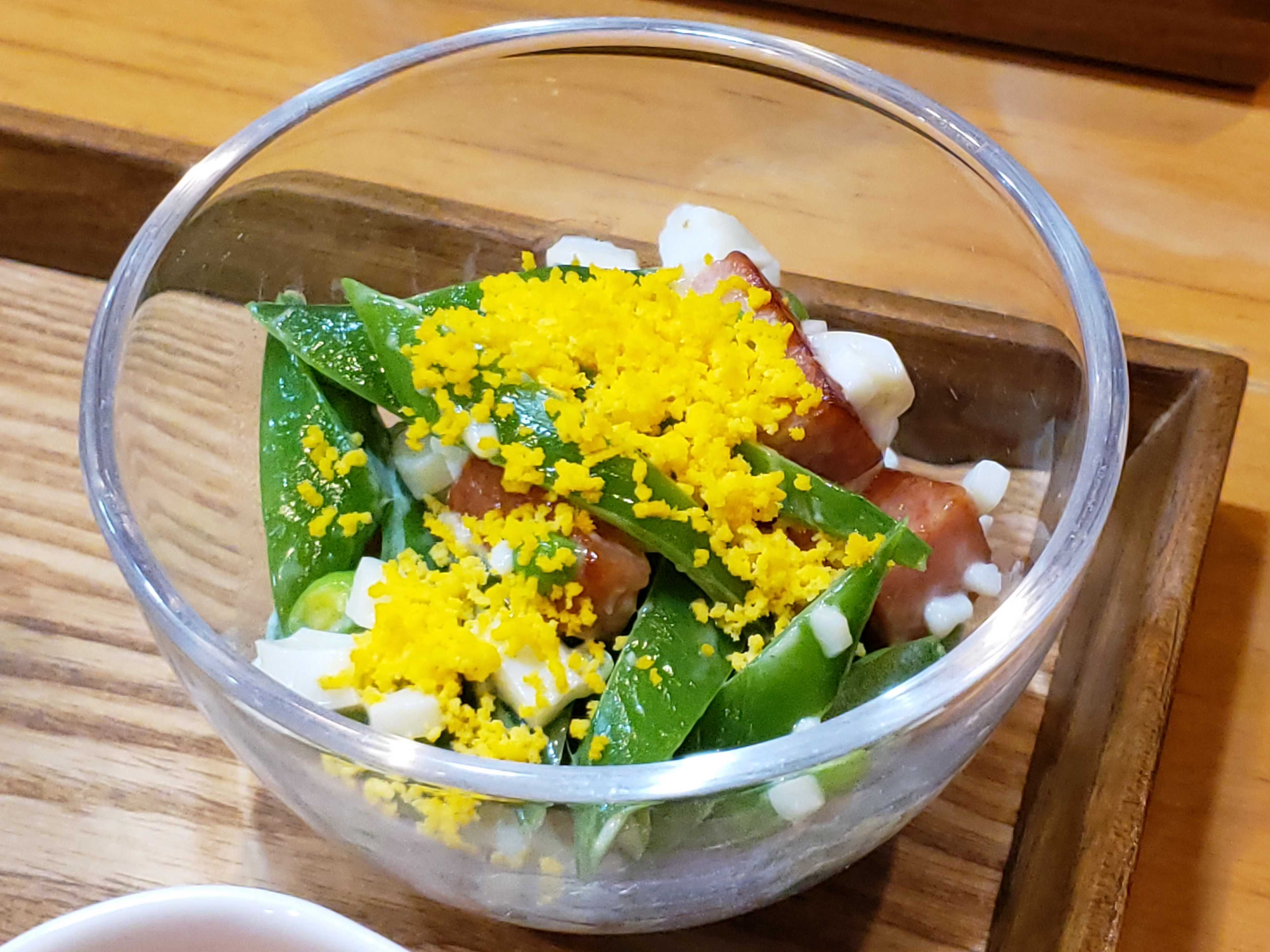 スパムとスナップエンドウ、卵のサラダは お洒落なサラダです。