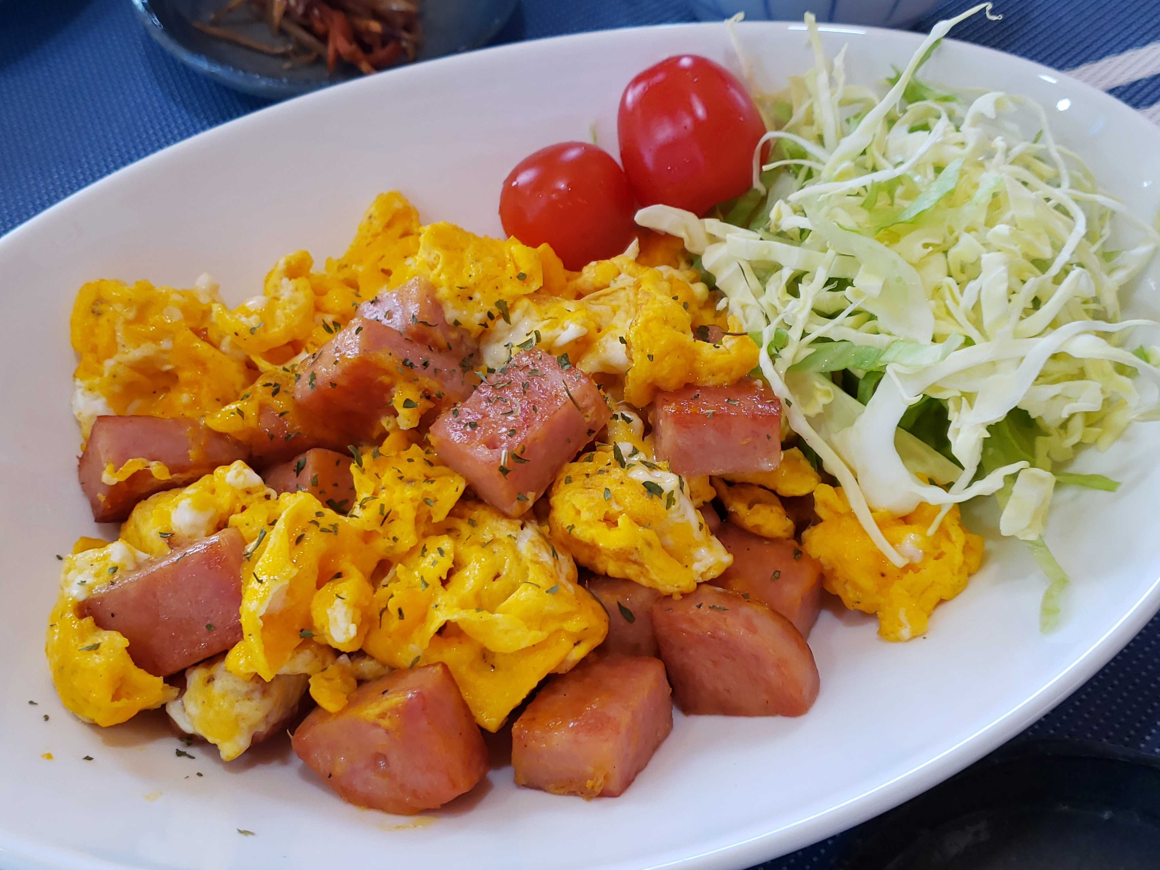 スパムを炒めた後一旦フライパンから取り出し卵を炒め再びスパムを戻して・・・、