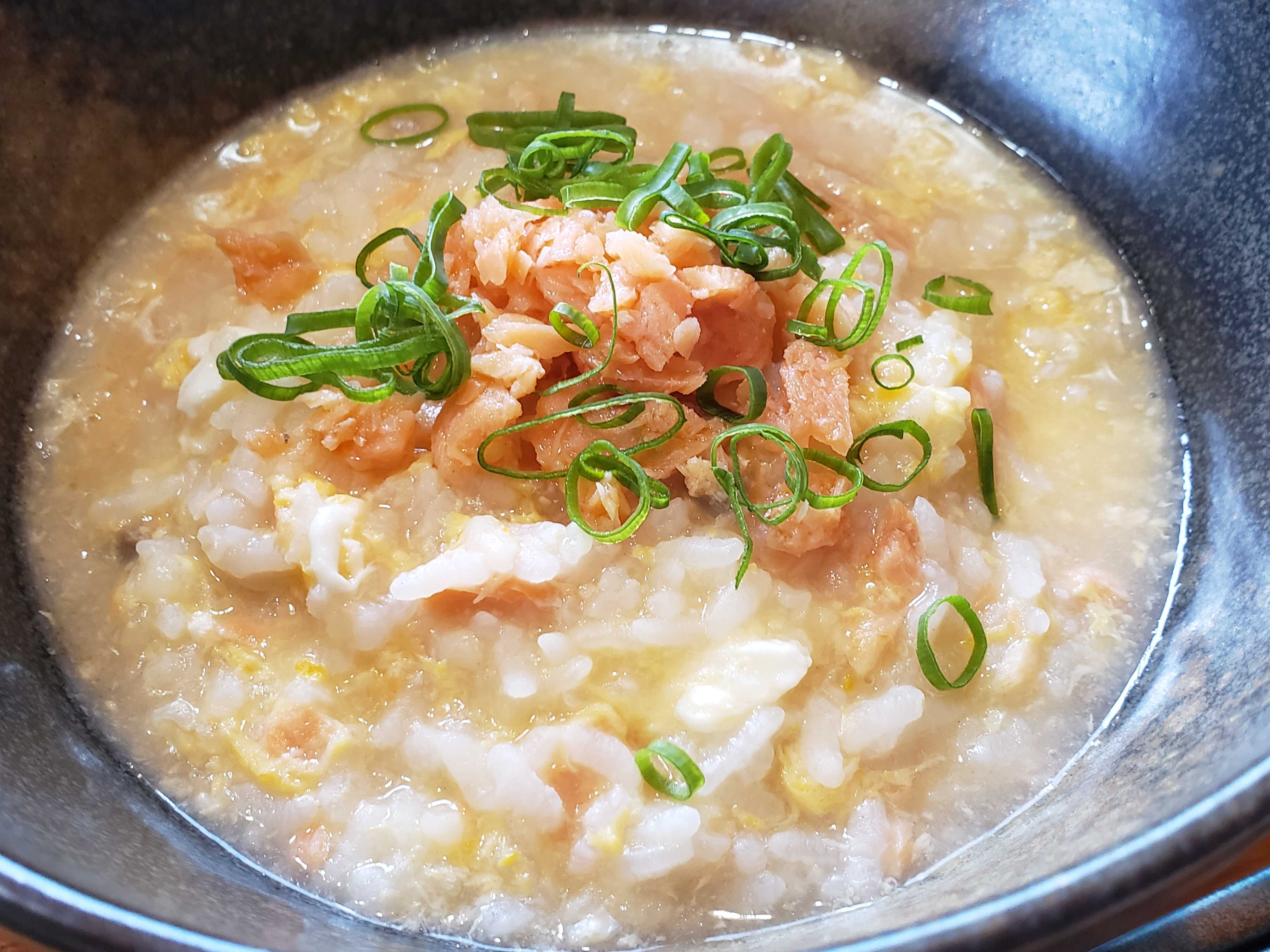 たっぷりの鮭フレーク、雑炊の中にも仕上げにもたっぷりのフレークでした。