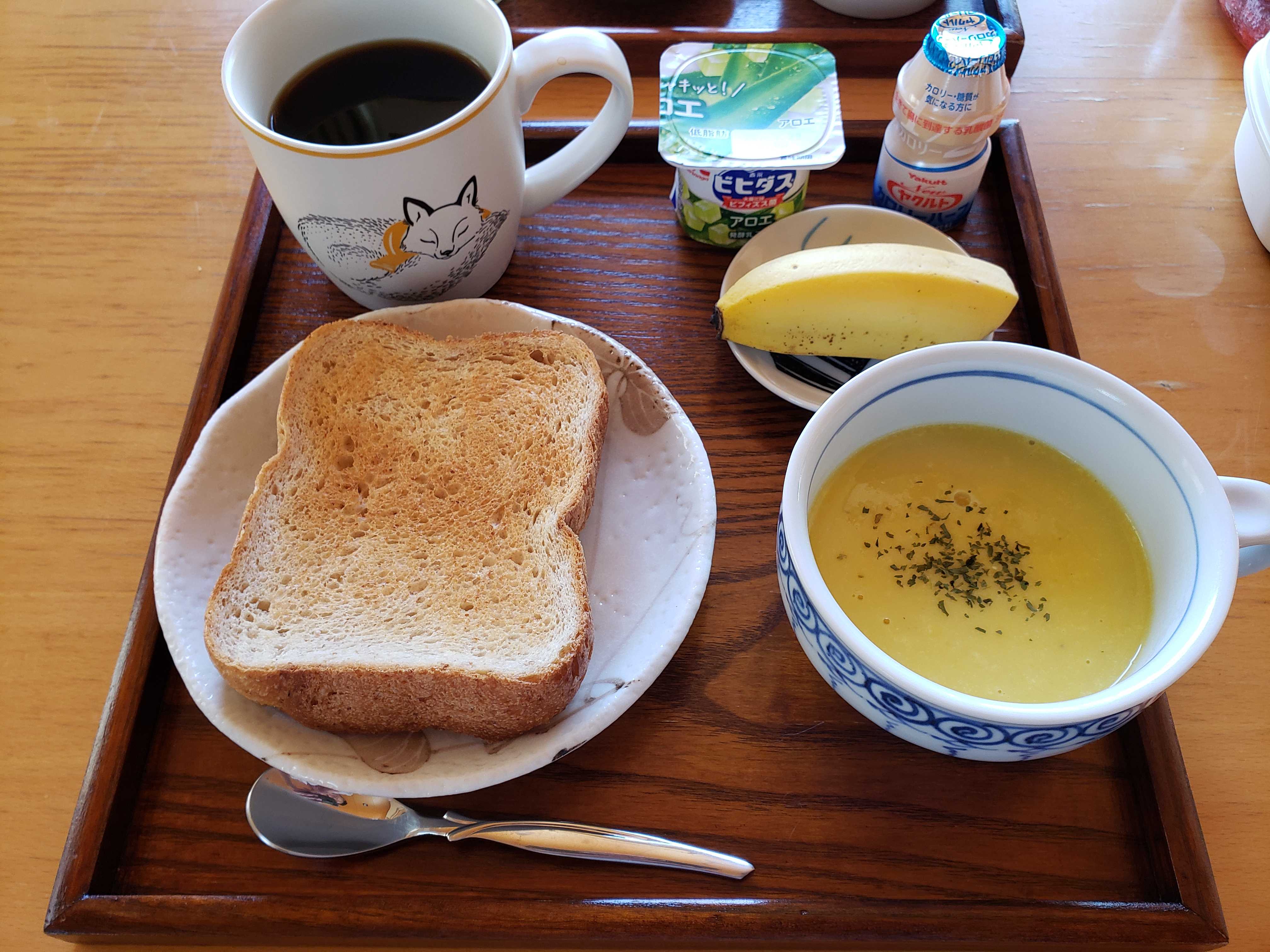 朝は冷凍してたカボチャペーストを牛乳で伸ばしたポタージュをぺろり