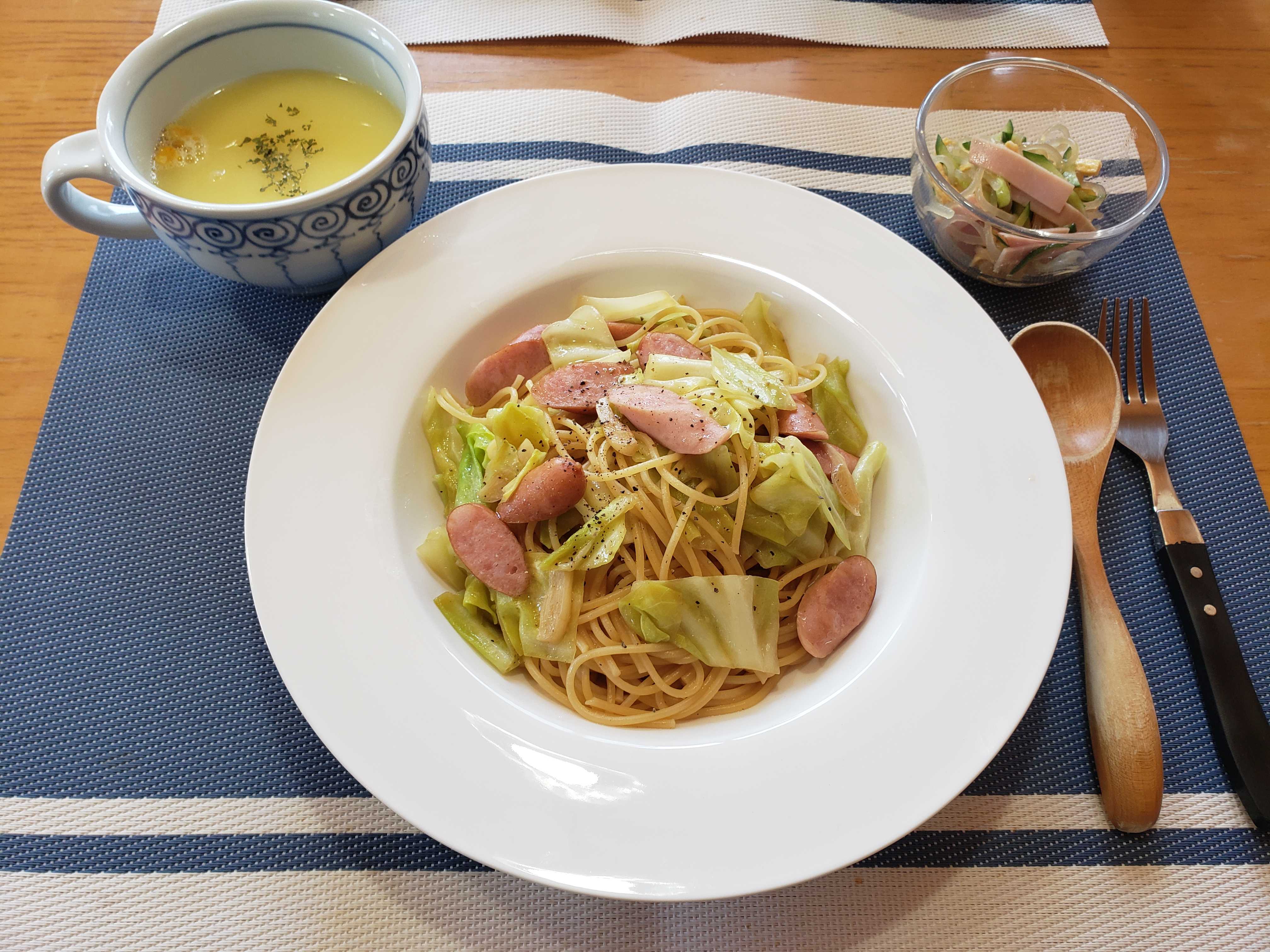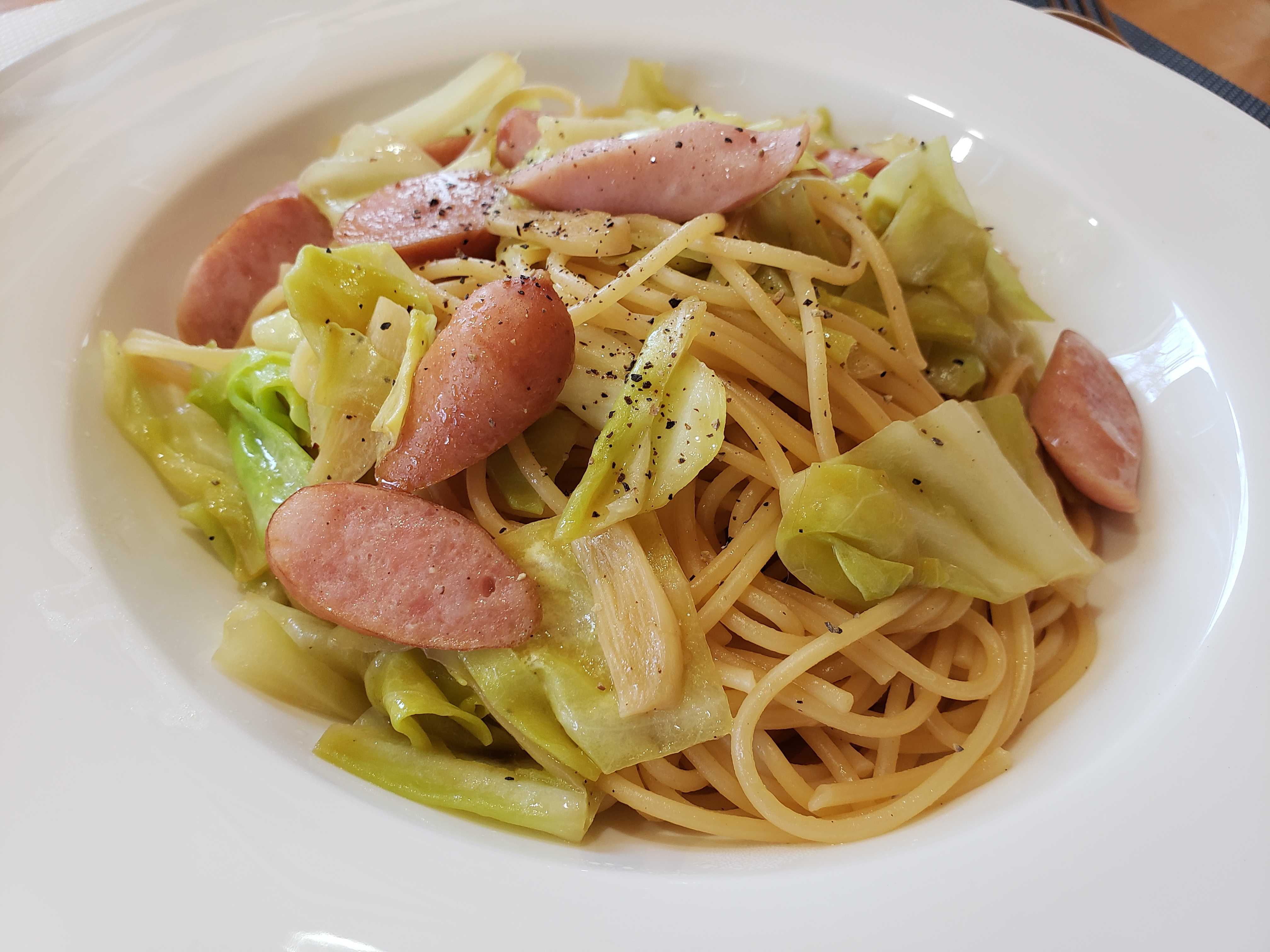 キャベツとウインナーのパスタ、うち採れキャベツの消費です。