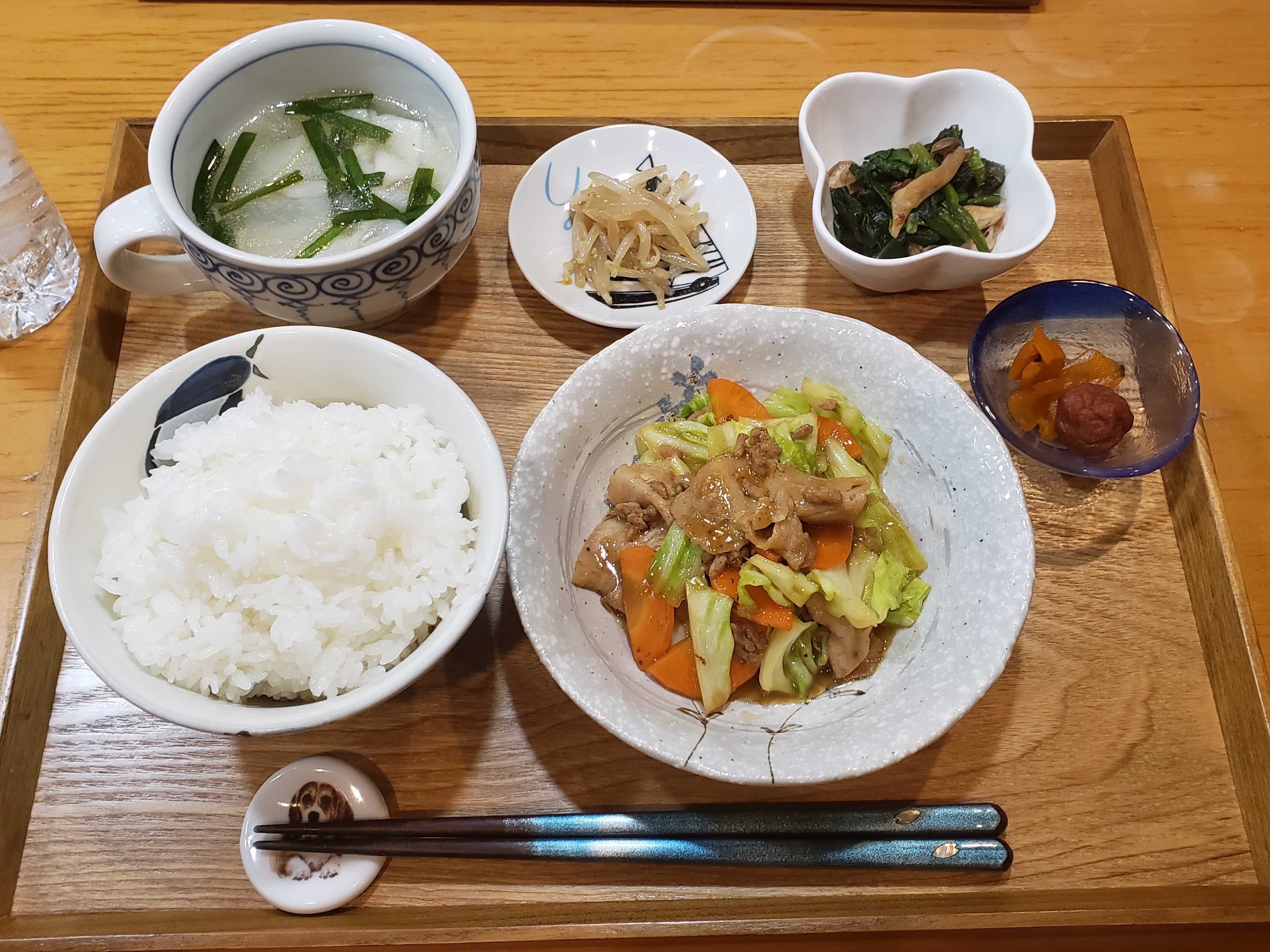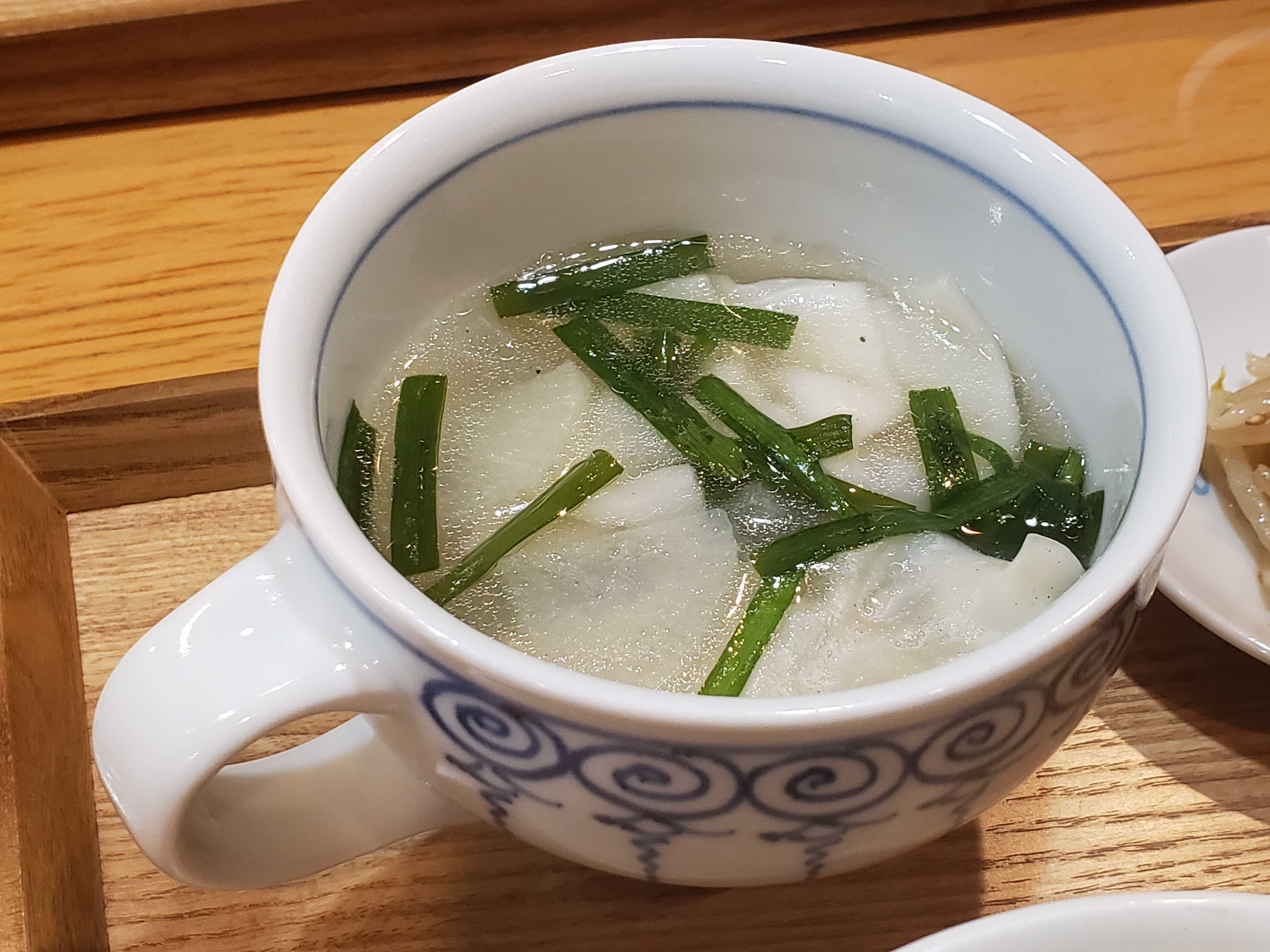 ご飯 水餃子スープ 梅干し 福神漬け
