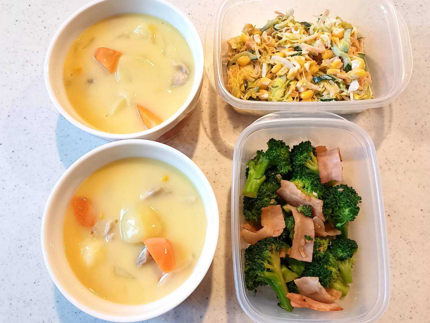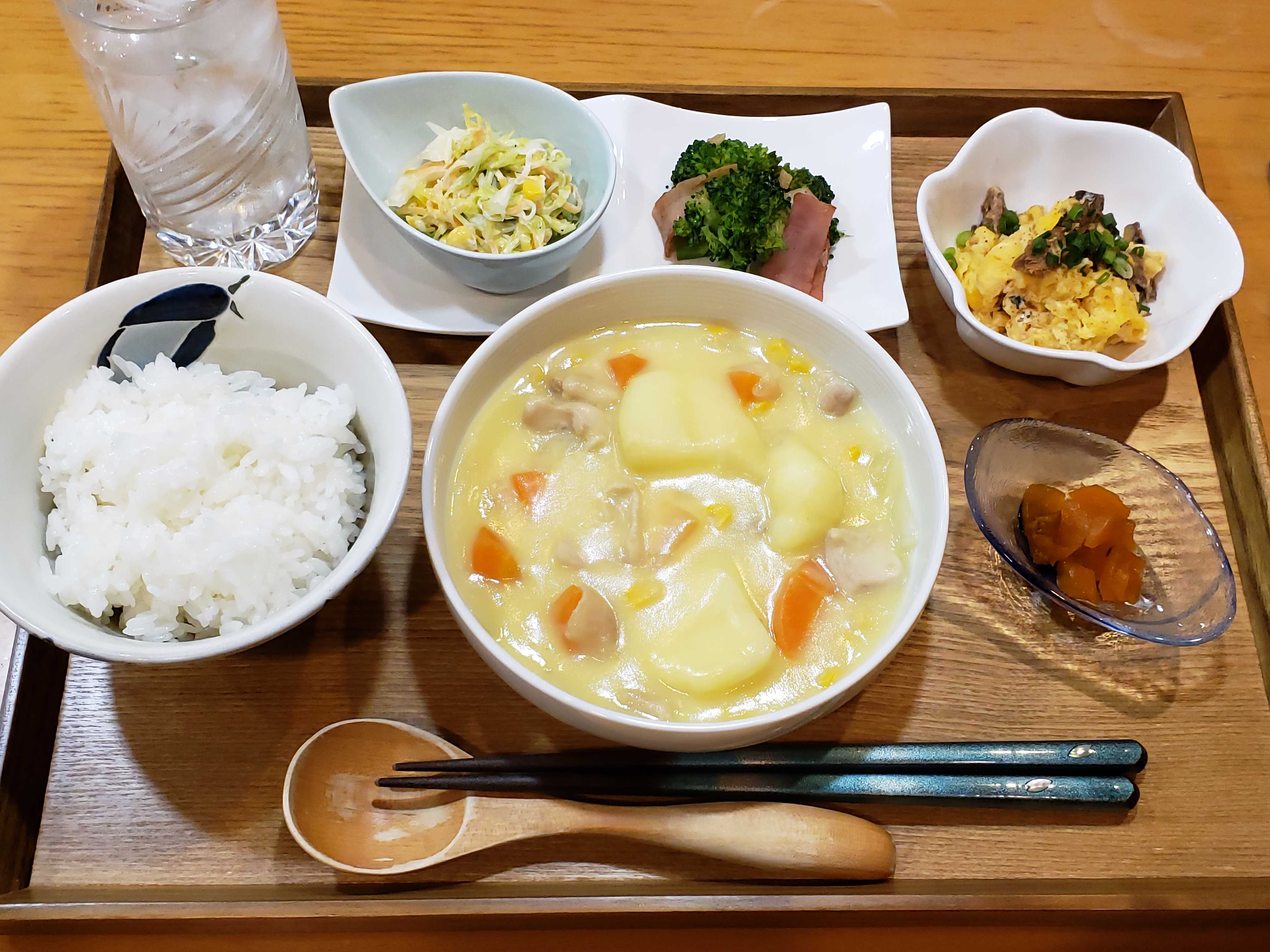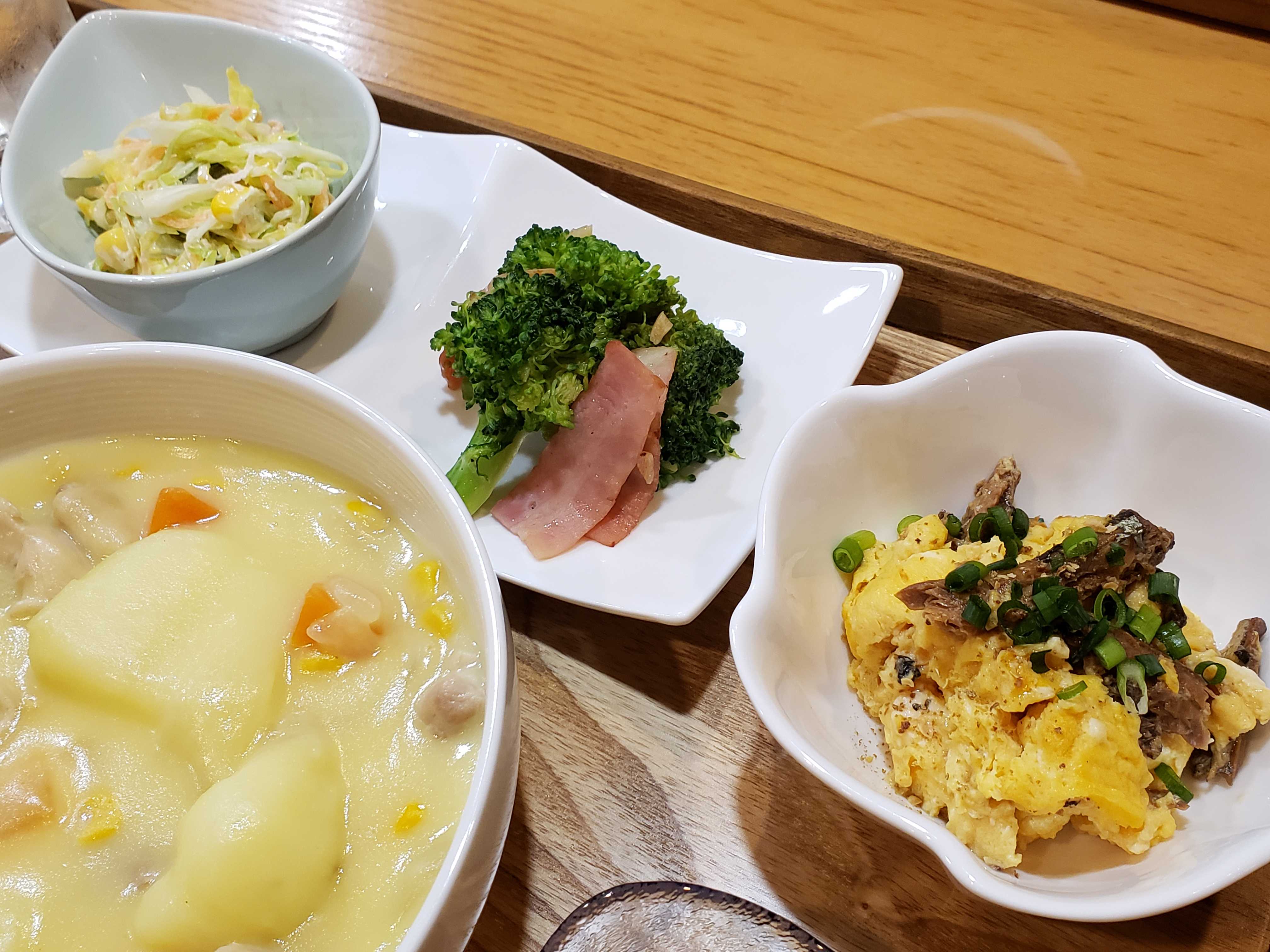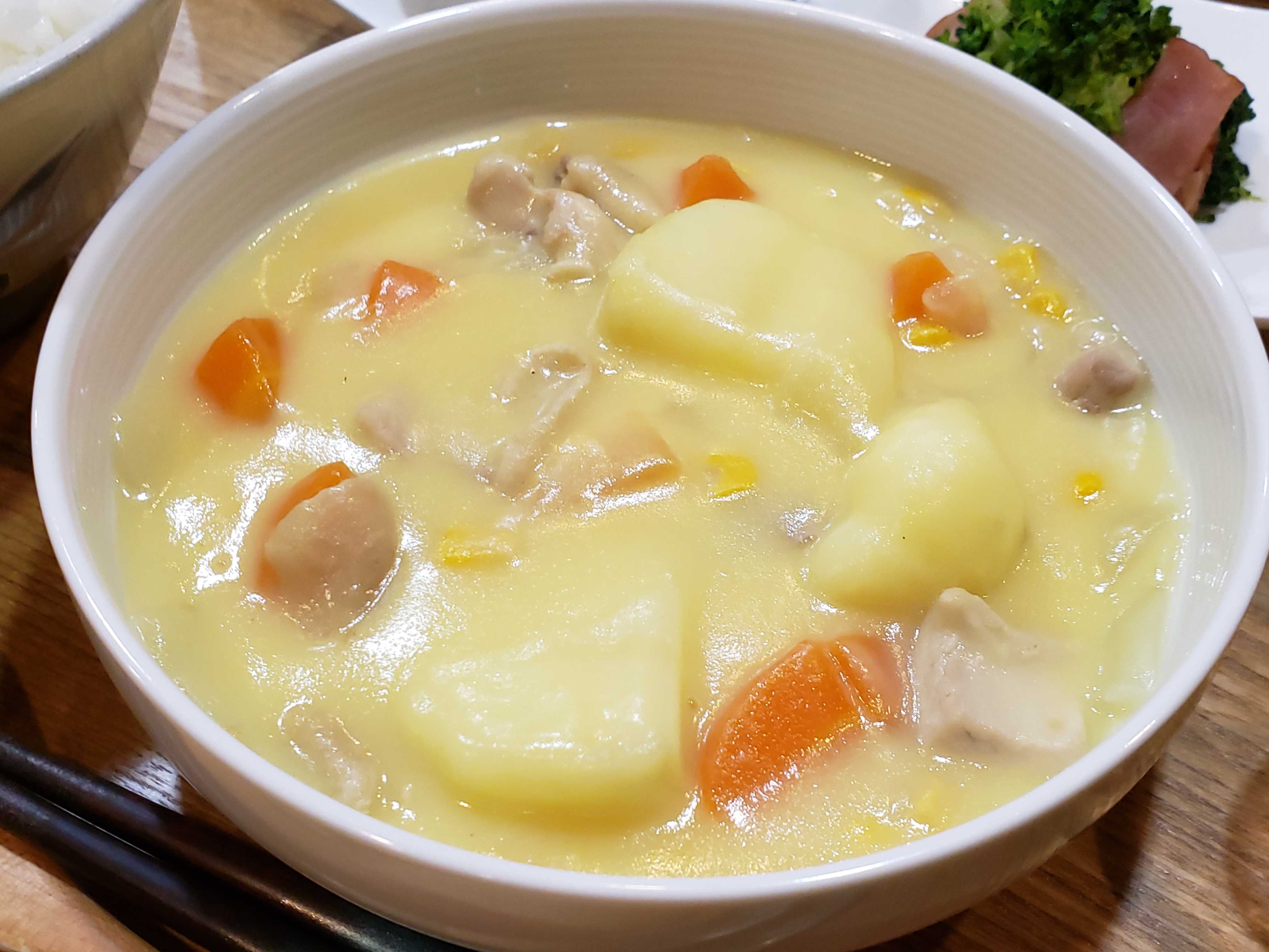 コーンクリームシチューは市販のルーの半分を使用、お袋さん所と半分こでちょうどでした。
