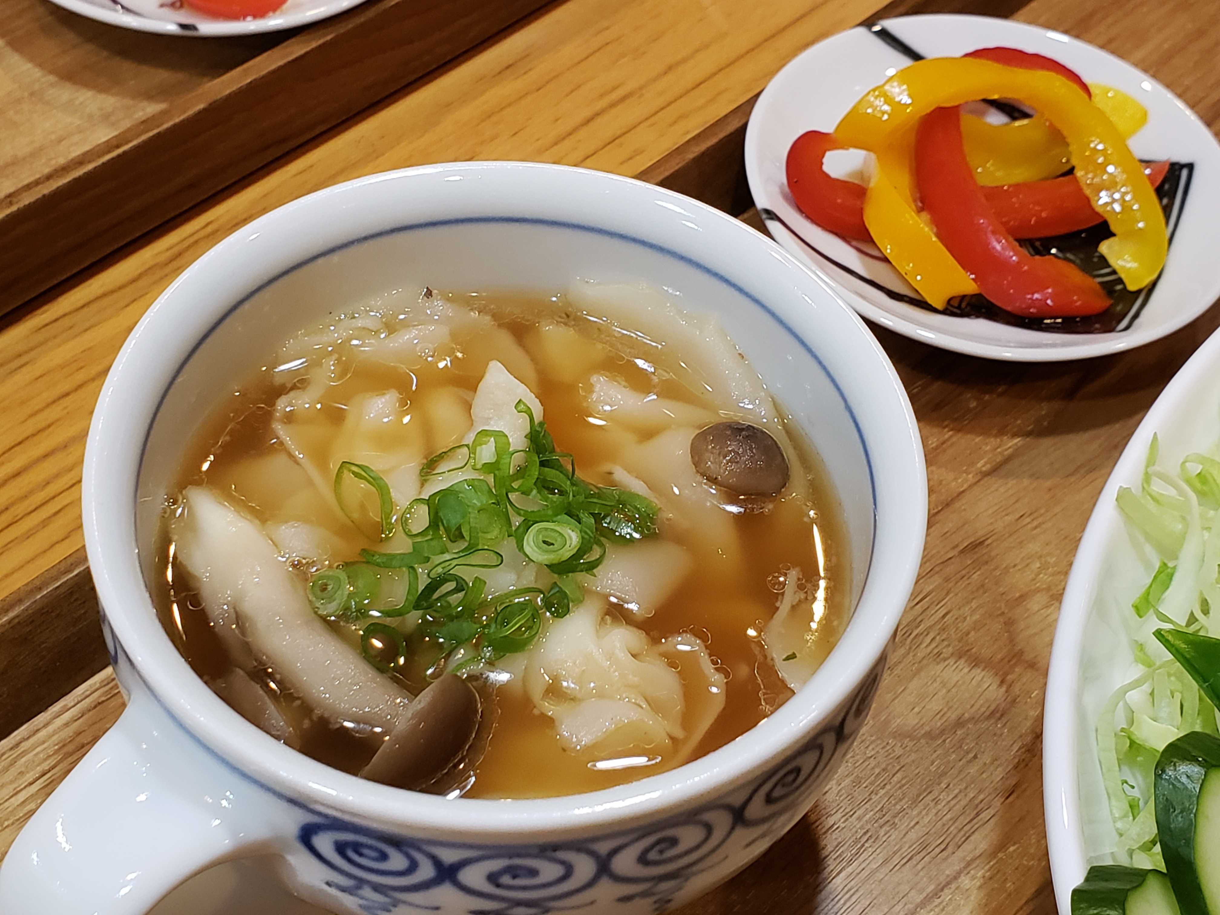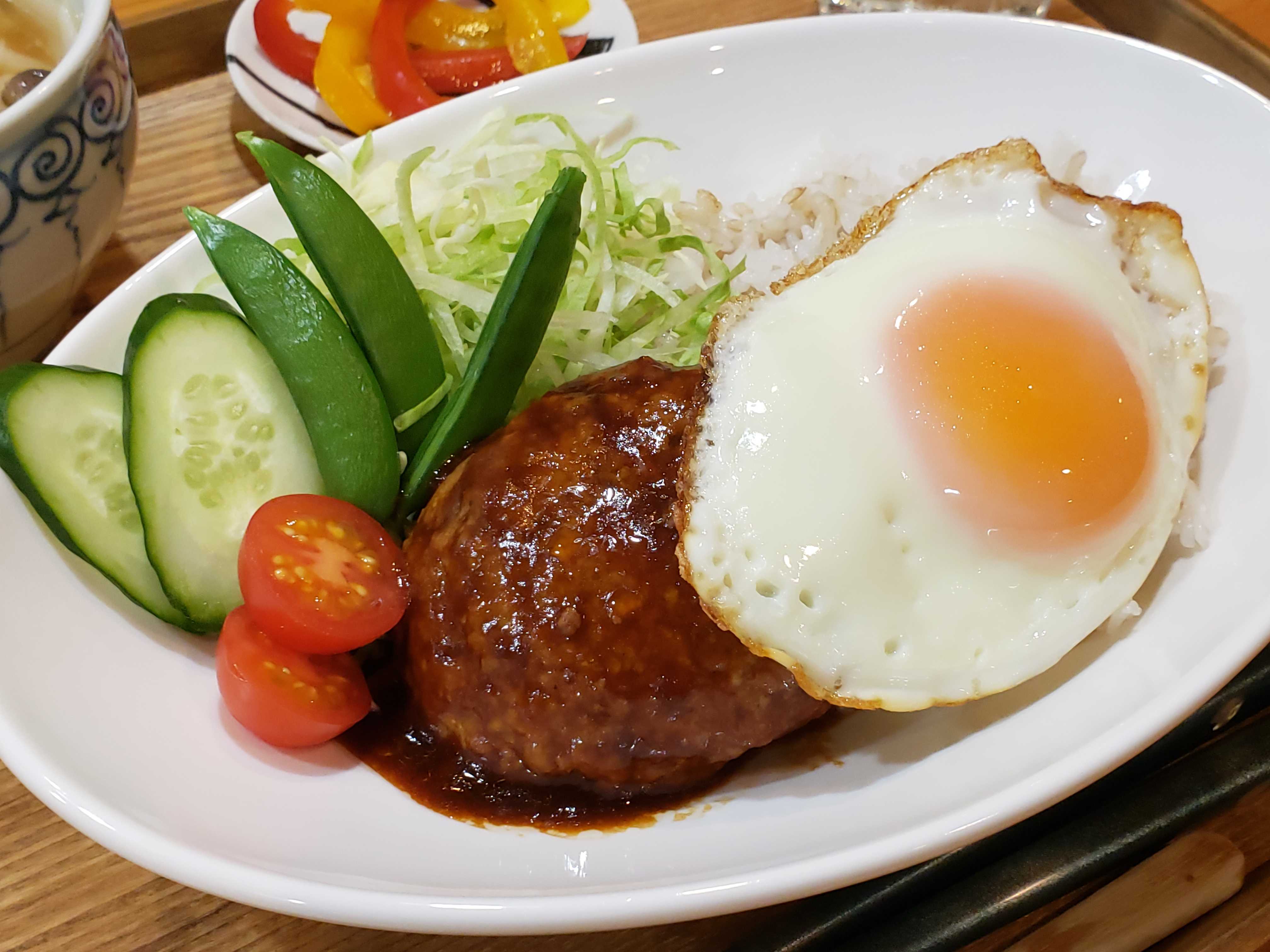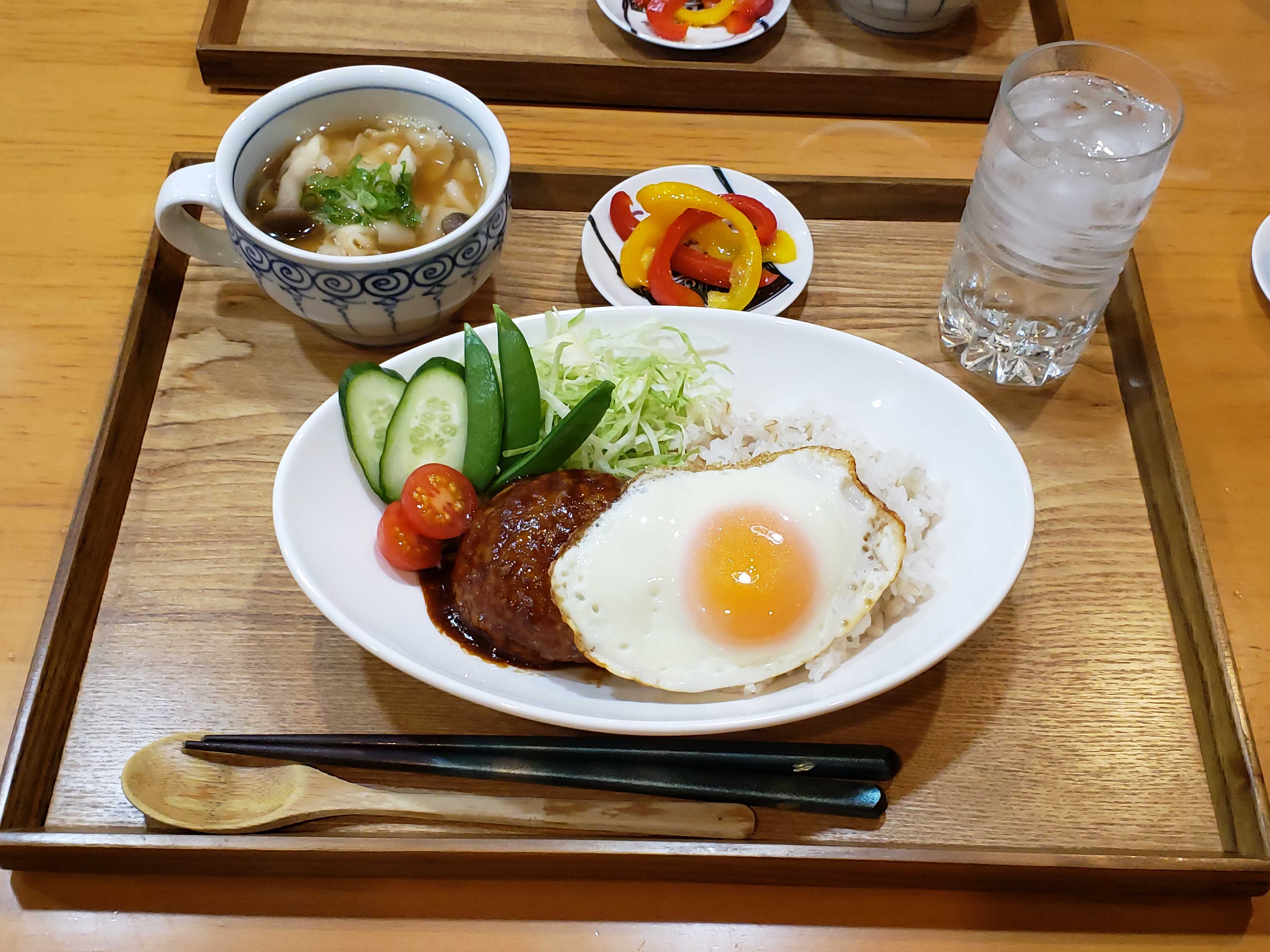 ハンバーグはレトルト食品、スープはワンタンスープです。
