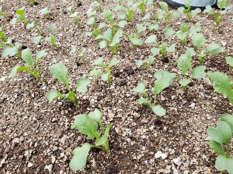 庭のは小さな畑にぎっしり、去年のこぼれ種から発芽しました。