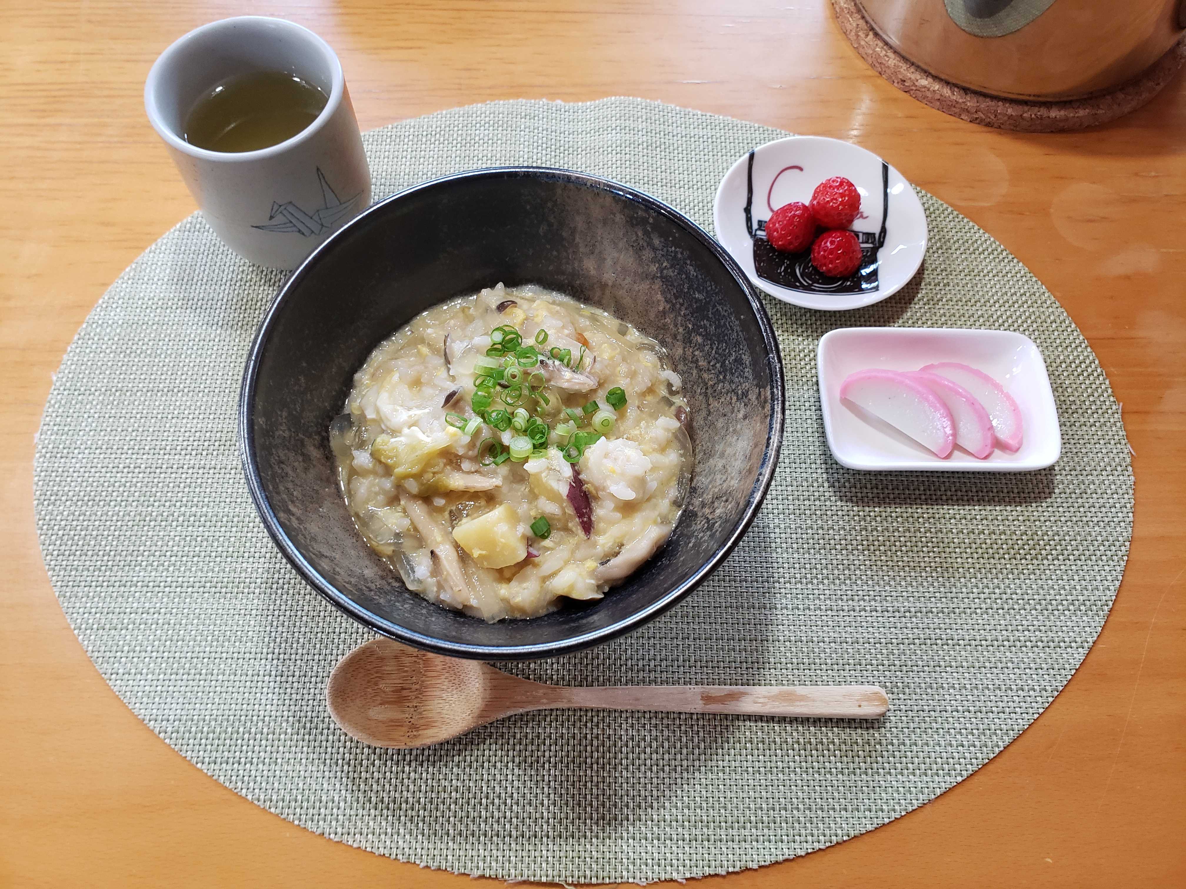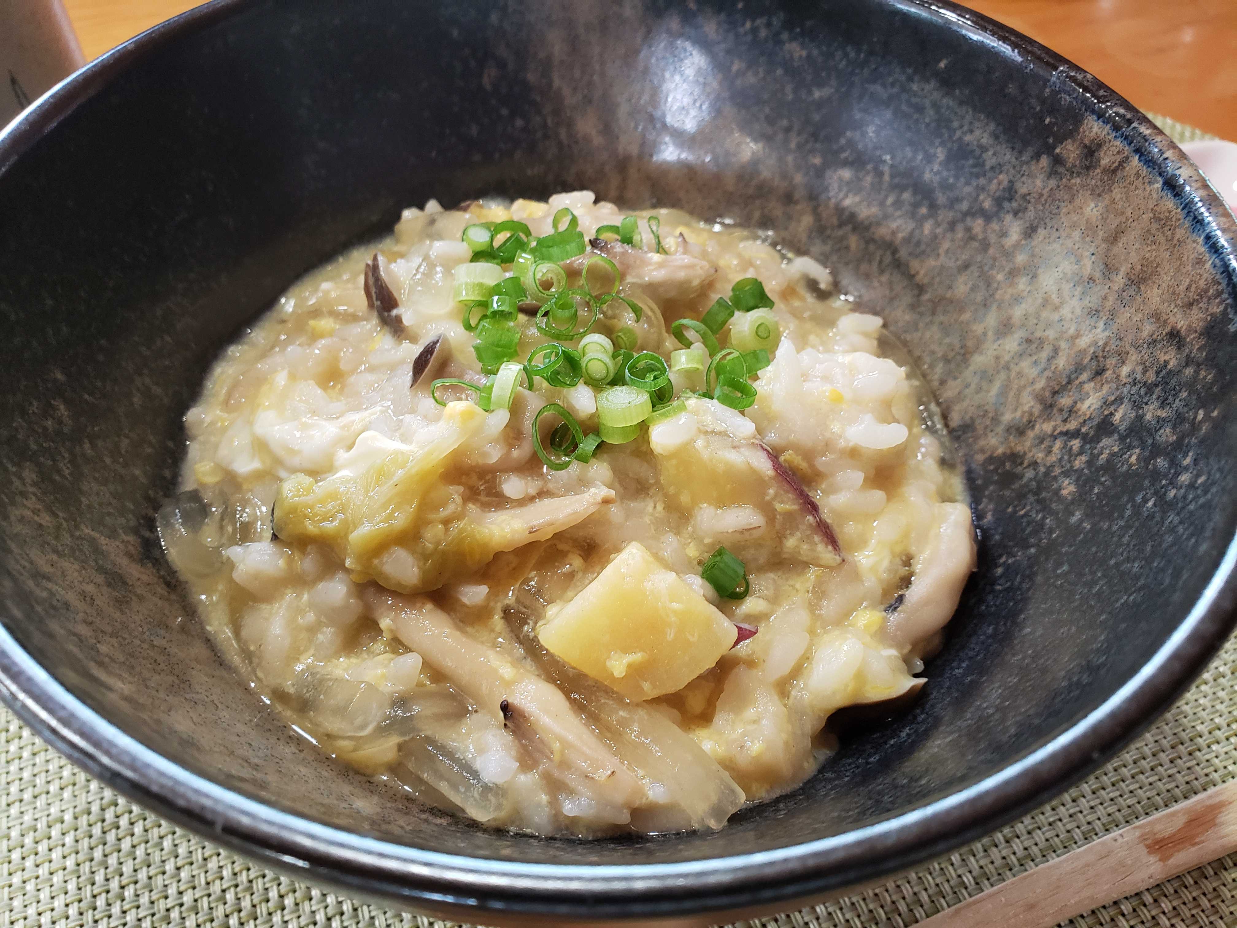 冷凍してるもち麦入りのご飯と薩摩芋ご飯で雑炊、