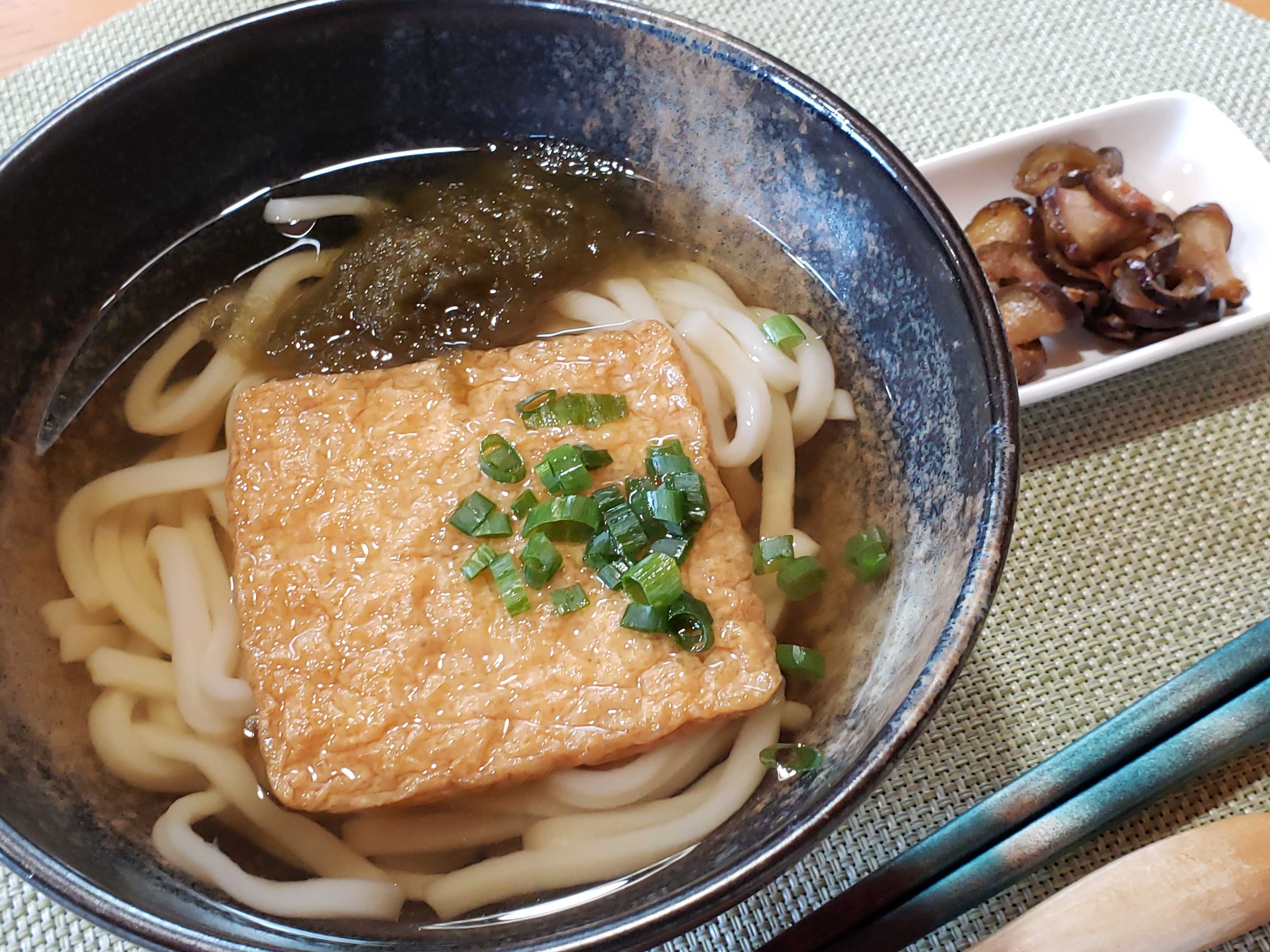 お昼は冷凍うどんできつねうどん