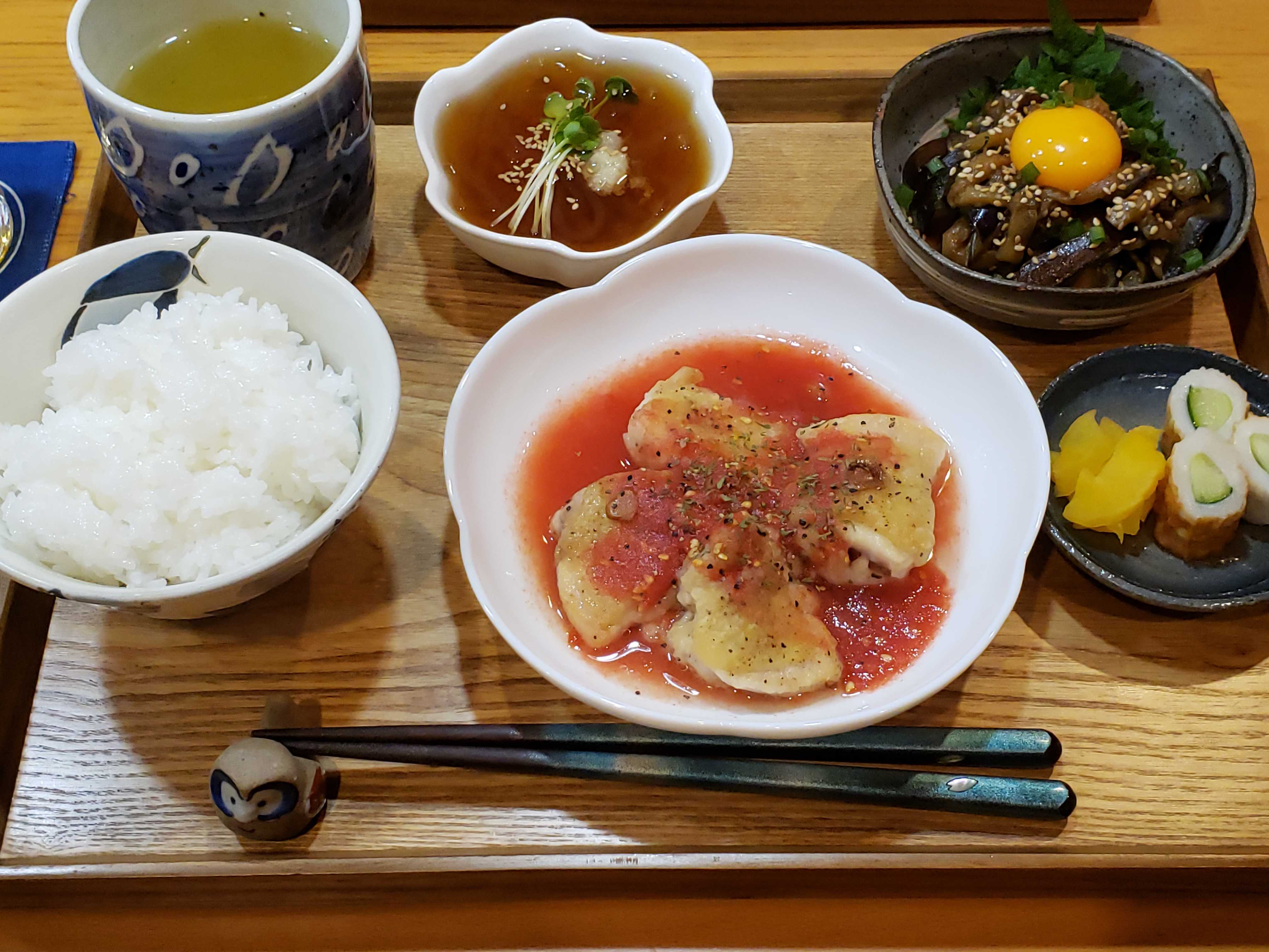 トッピングにとろろ昆布、小鉢は茄子の梅肉おかか和えでした。