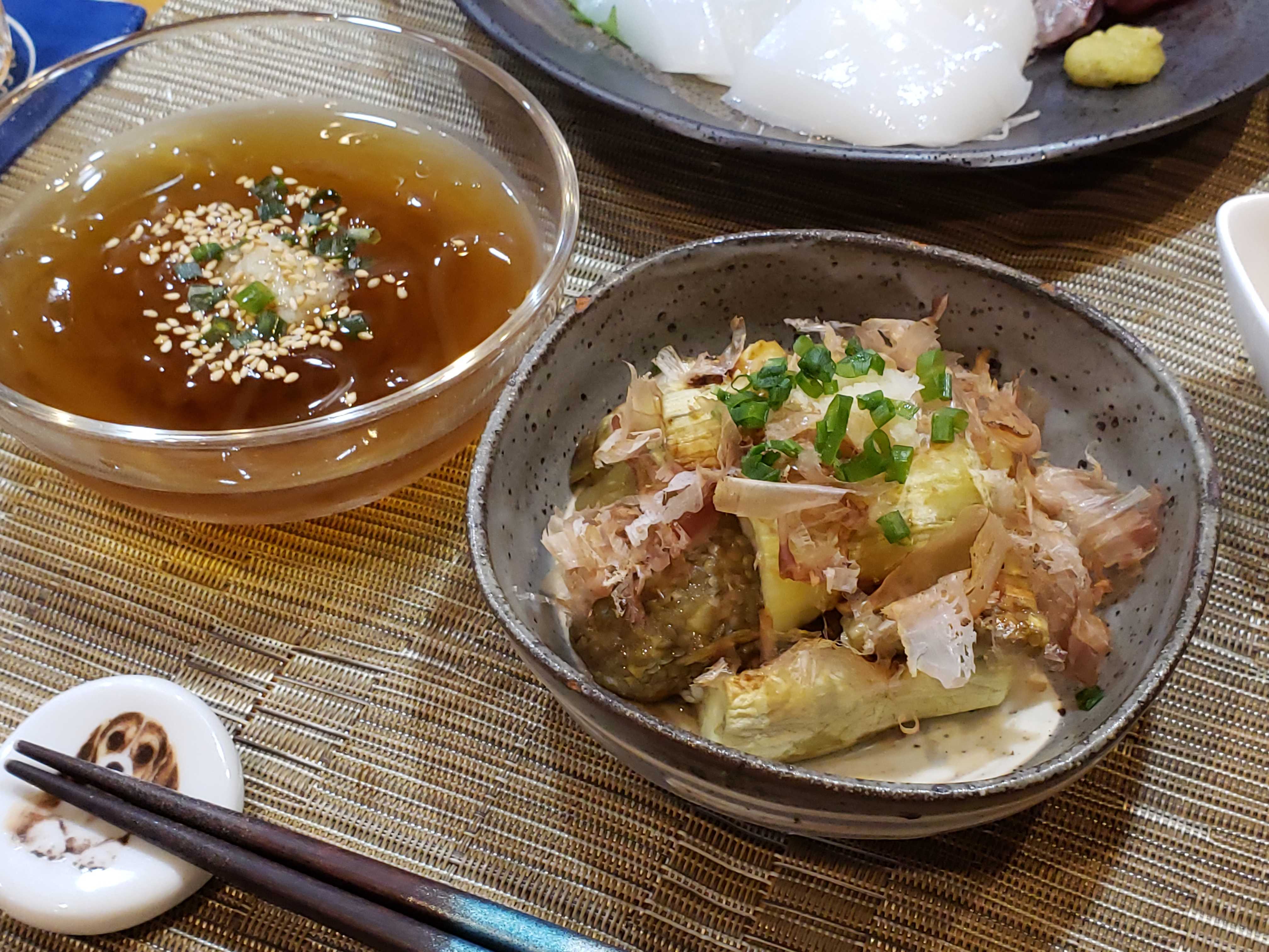 小鉢はところてん、焼きナス、ゴーヤのお浸しでした。