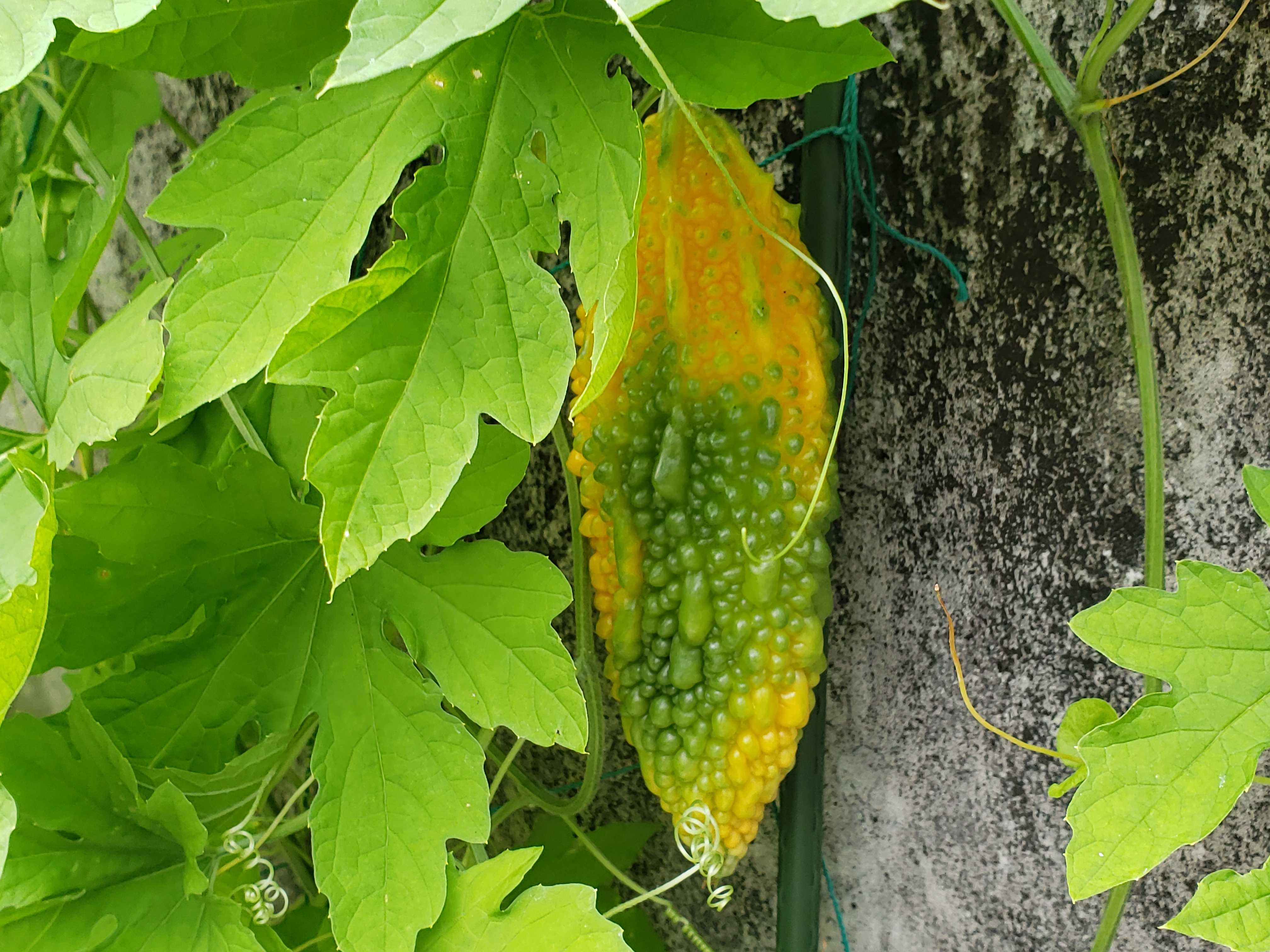 食後、畑で収穫をしてるともう少し大きくなってと思ってたゴーヤが熟れちゃってました。