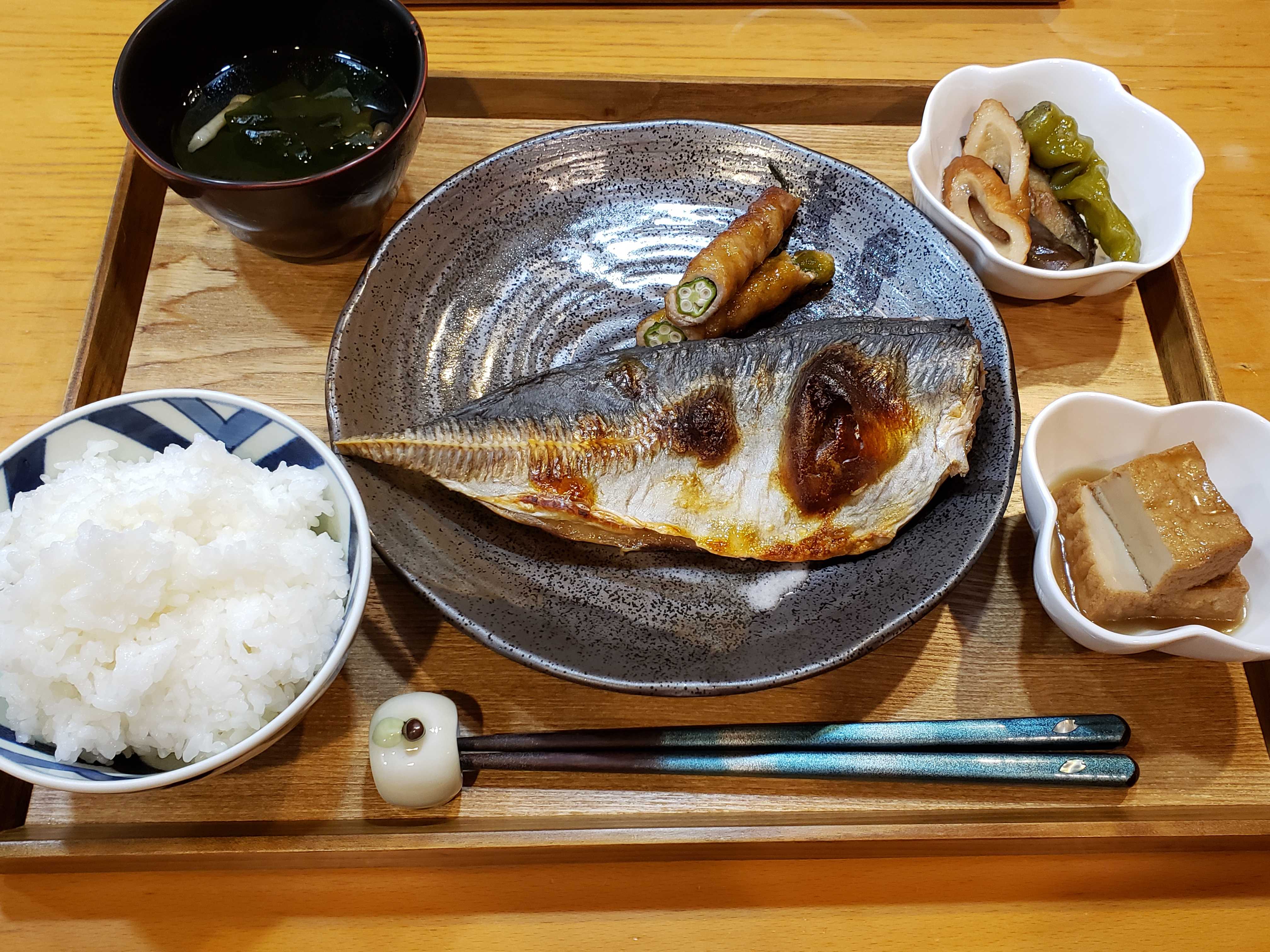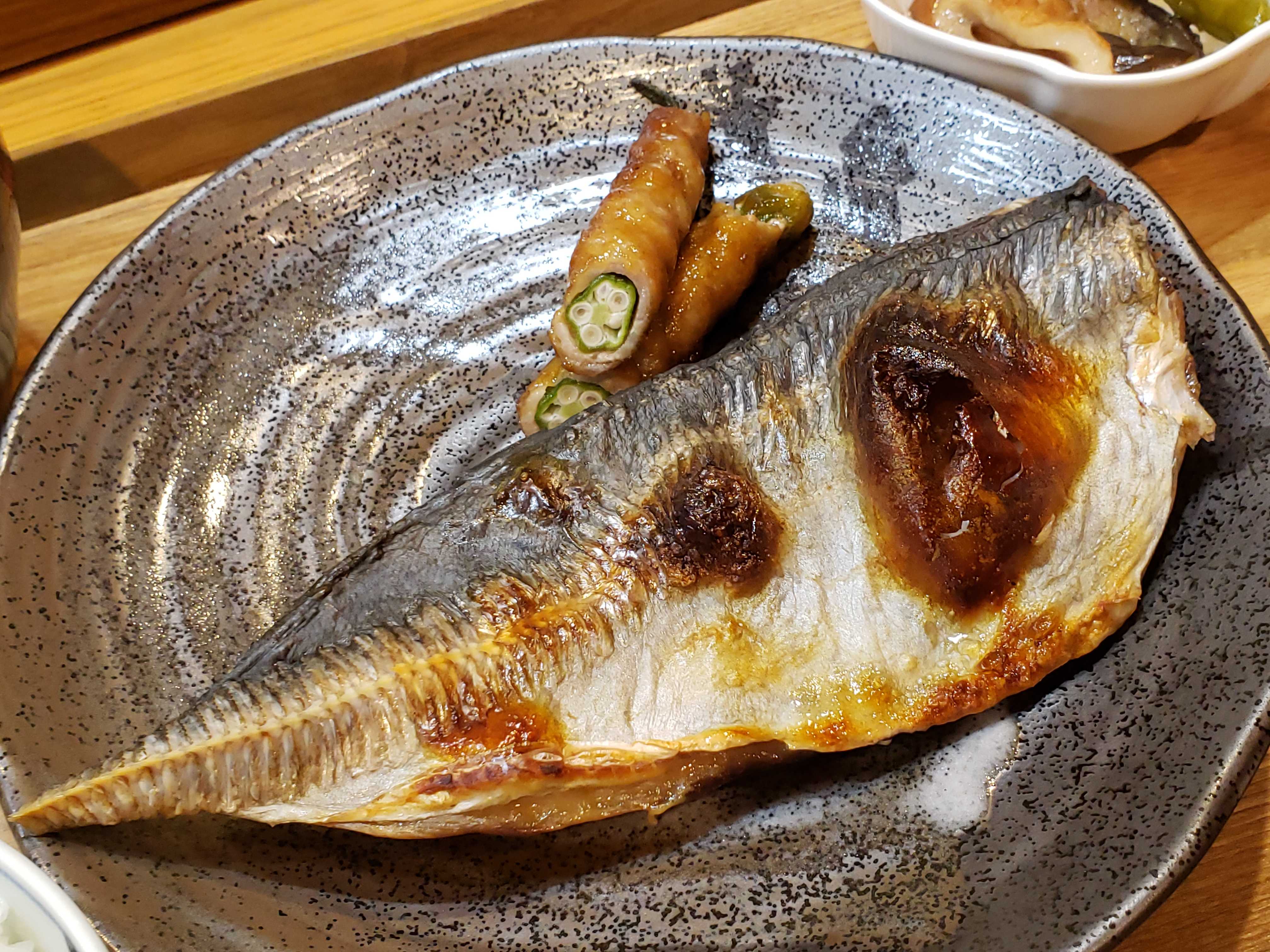 夕食は特大の鯵の干物にオクラの肉巻きでした。