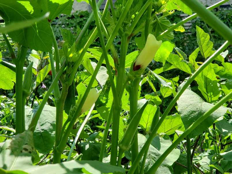 種を蒔いても苗を植えても根きり虫に倒されたオクラ、今年はダメかなと思ってましたが、丸オクラはパピーの背丈にとどく程に