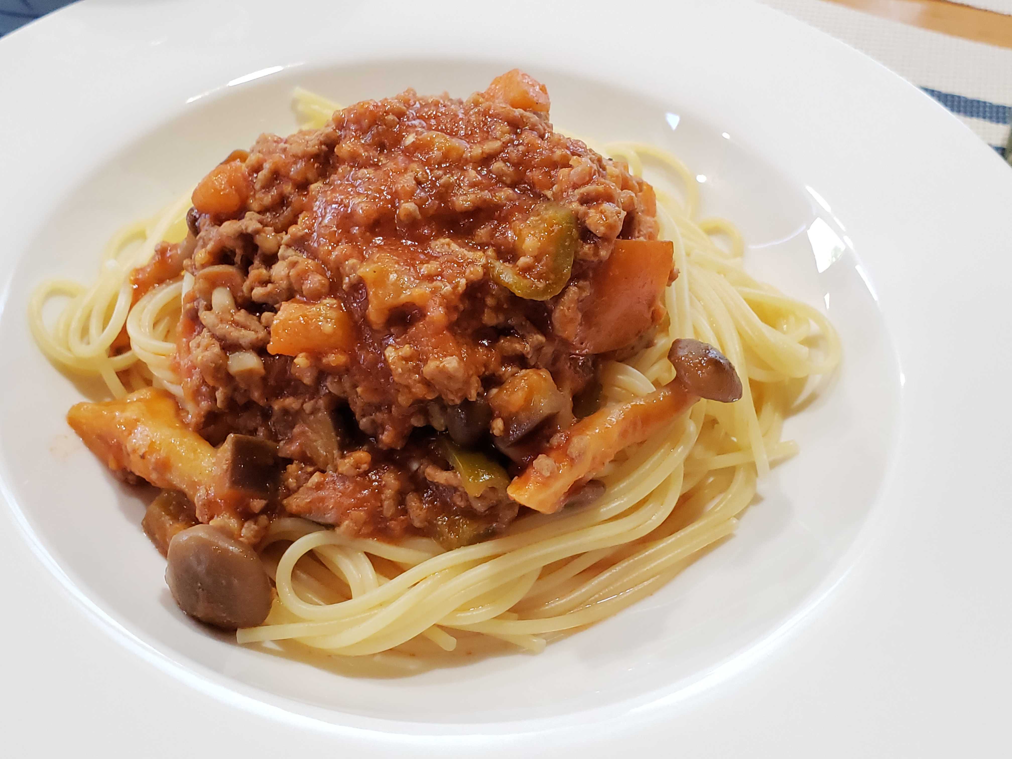 茄子にパプリカ、しめじが入ったミートソース、