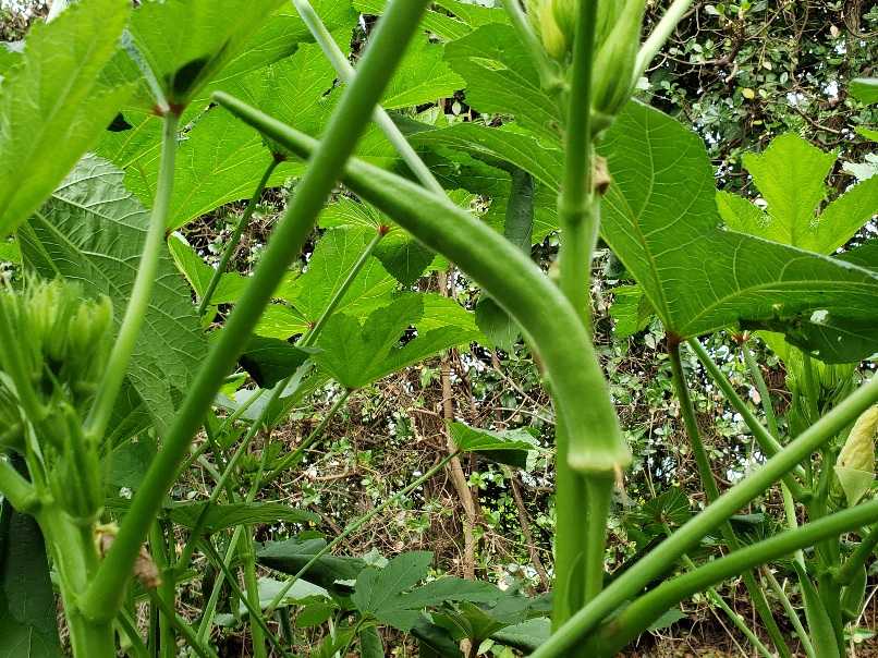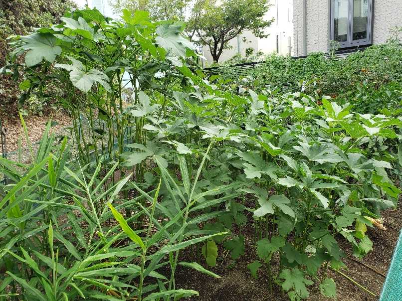 手前が占領茄子、奥に六角オクラと丸オクラ、 解りにくいね