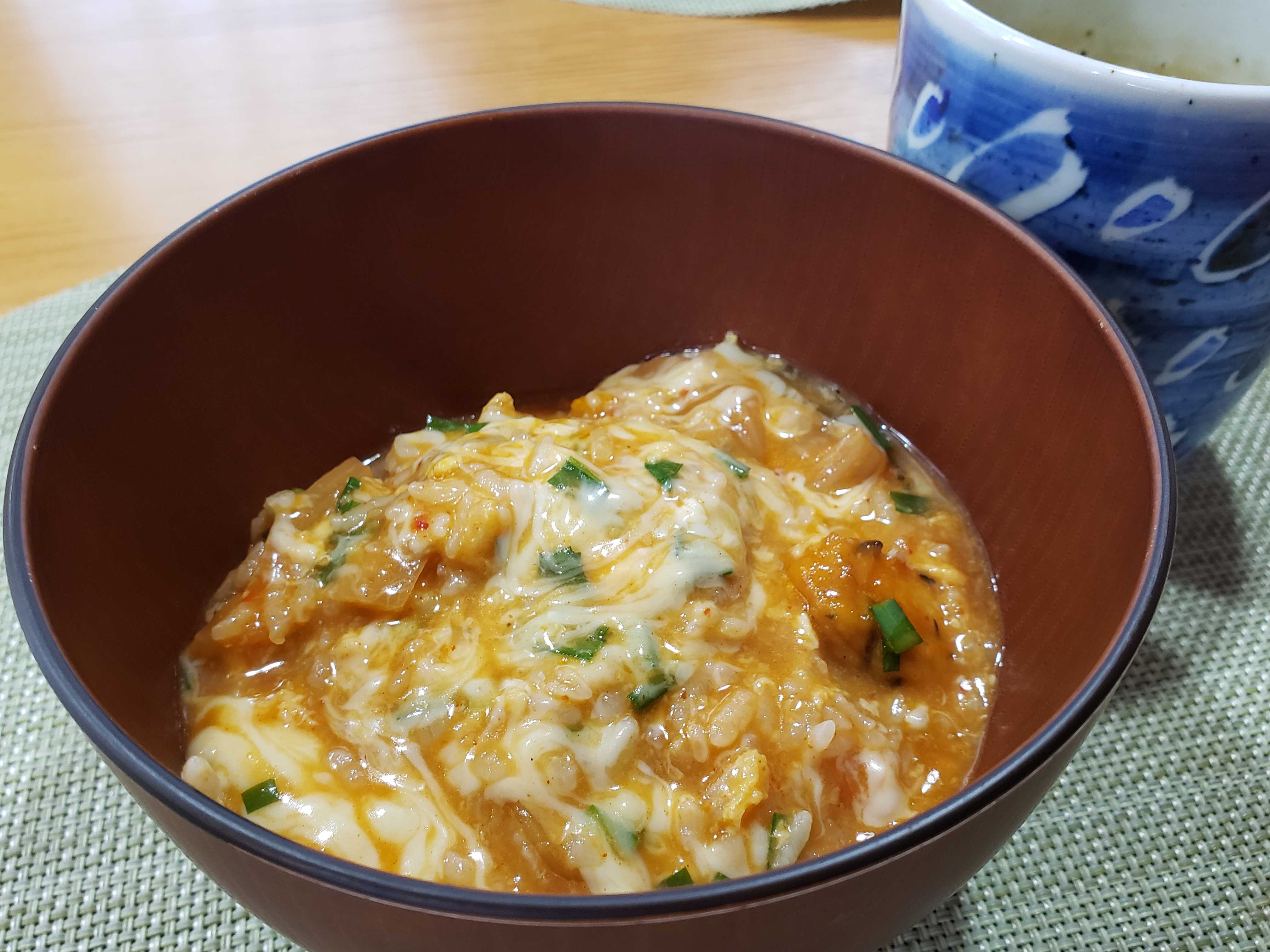 キムチ鍋のだし汁に溶き卵、チーズをたっぷりでした。