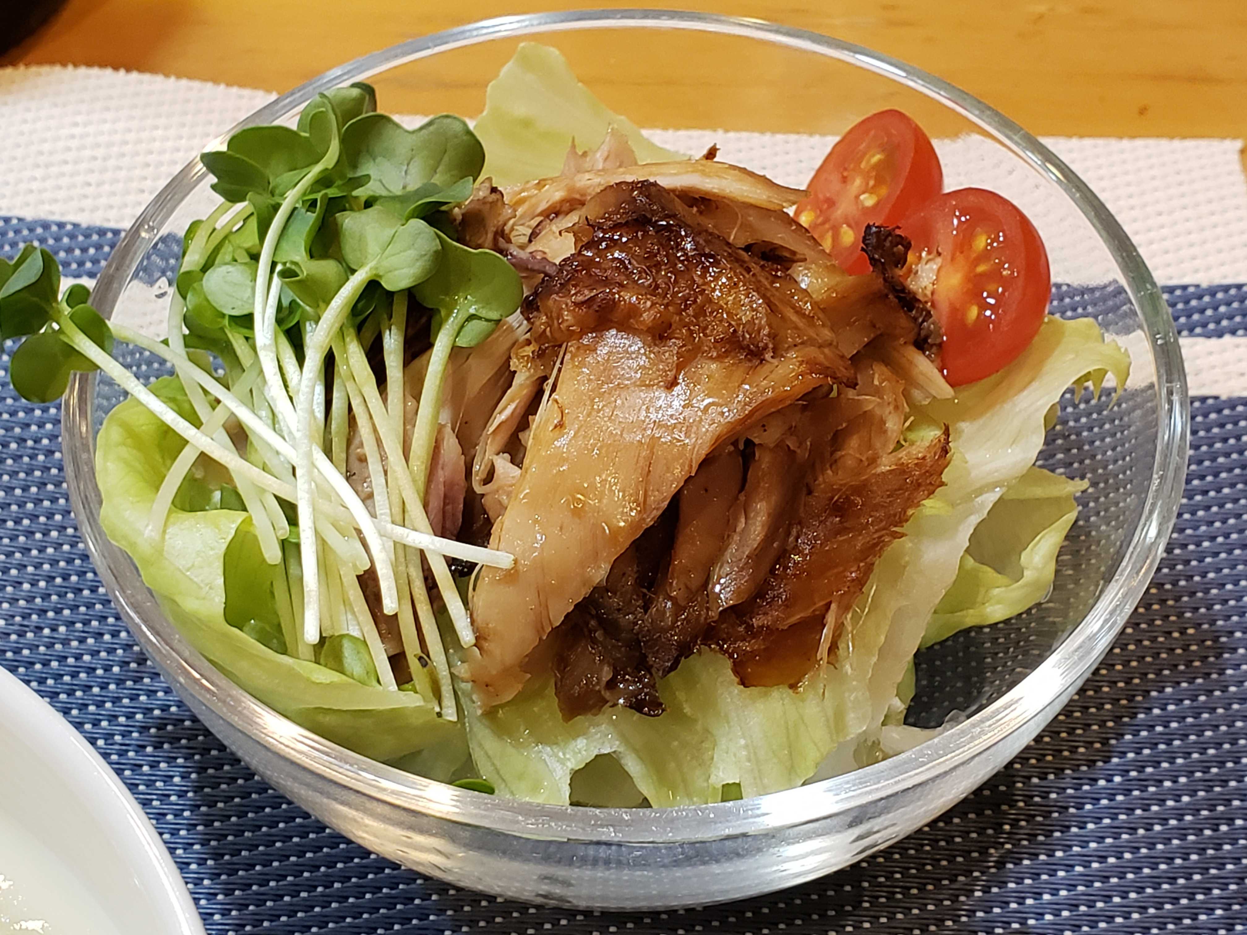 サラダのトッピングに前日に残ったまるっぽ鶏を乗せました。