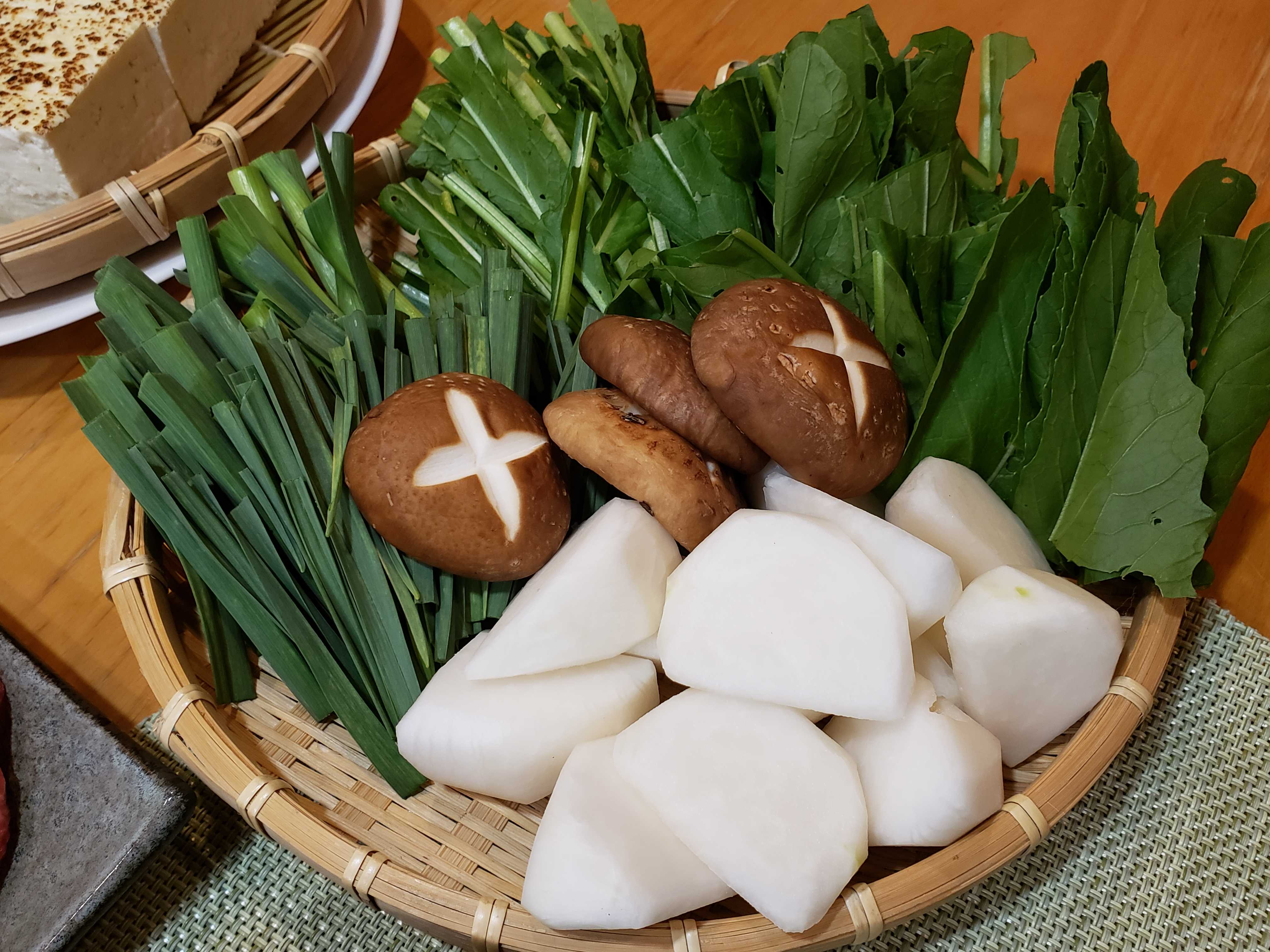 野菜は家にある物を、今季初のにんにく葉も入れました。
