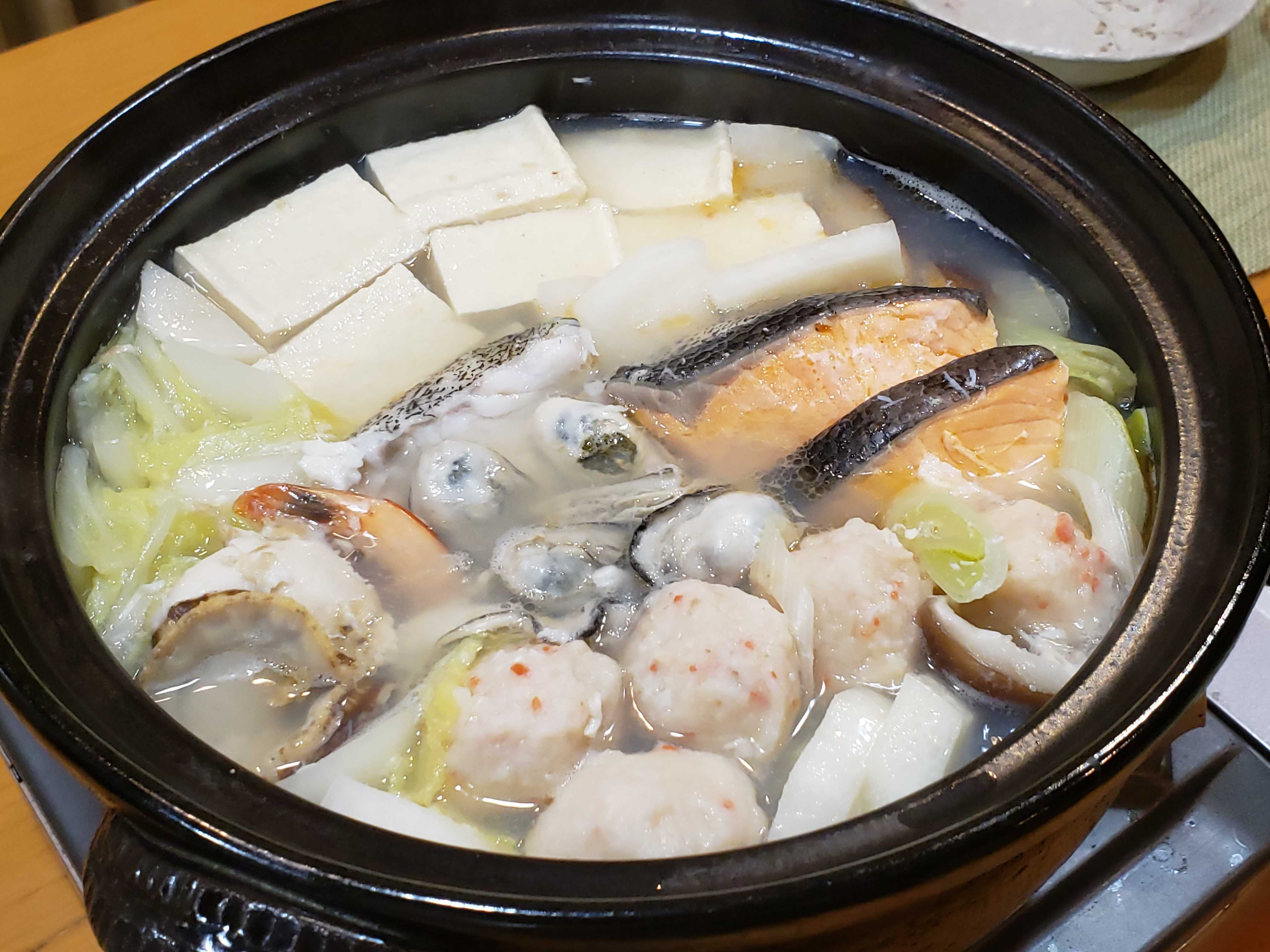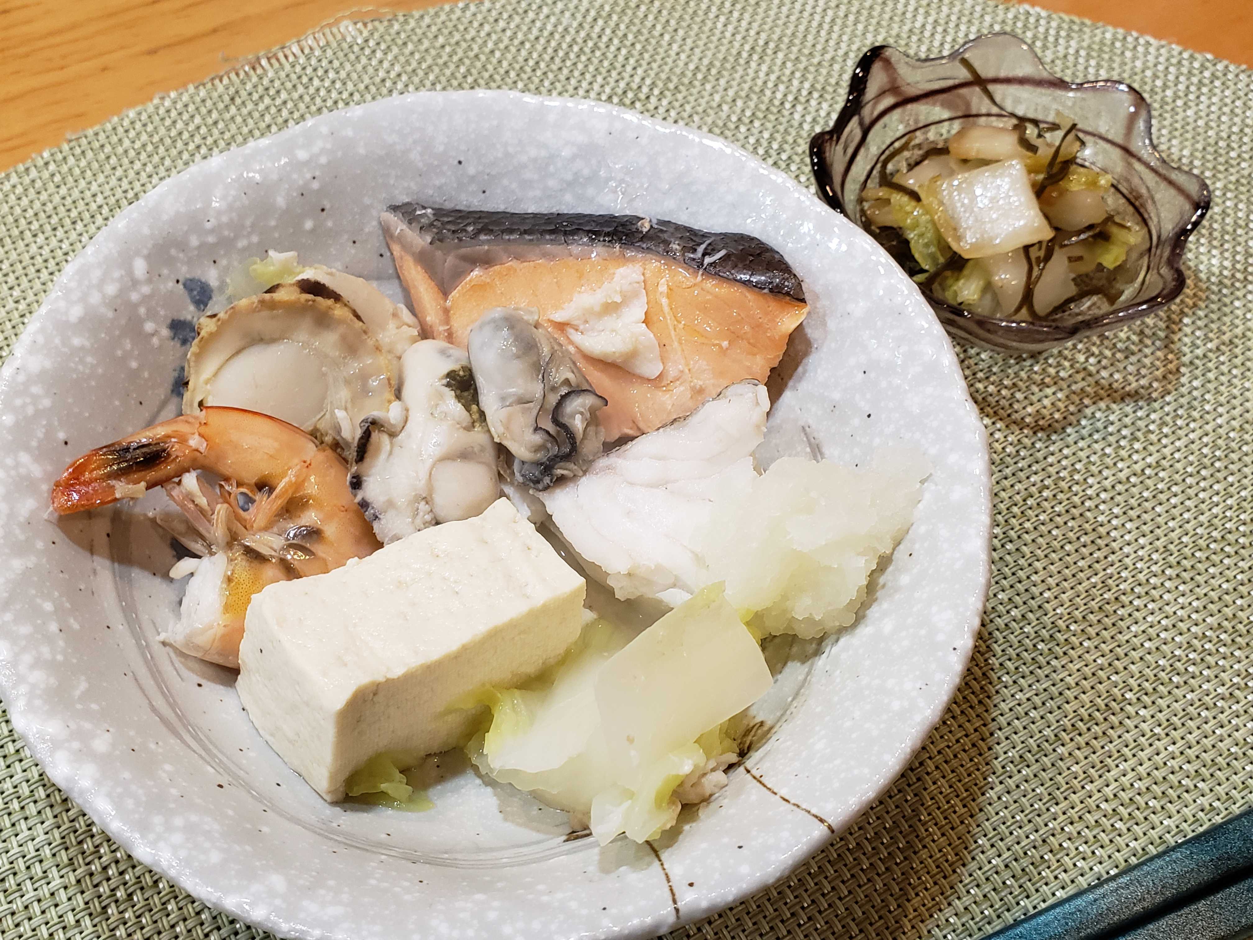 鮭、タラ、ホタテ、海老などが入った鍋セット+牡蠣、かに入りつみれ、