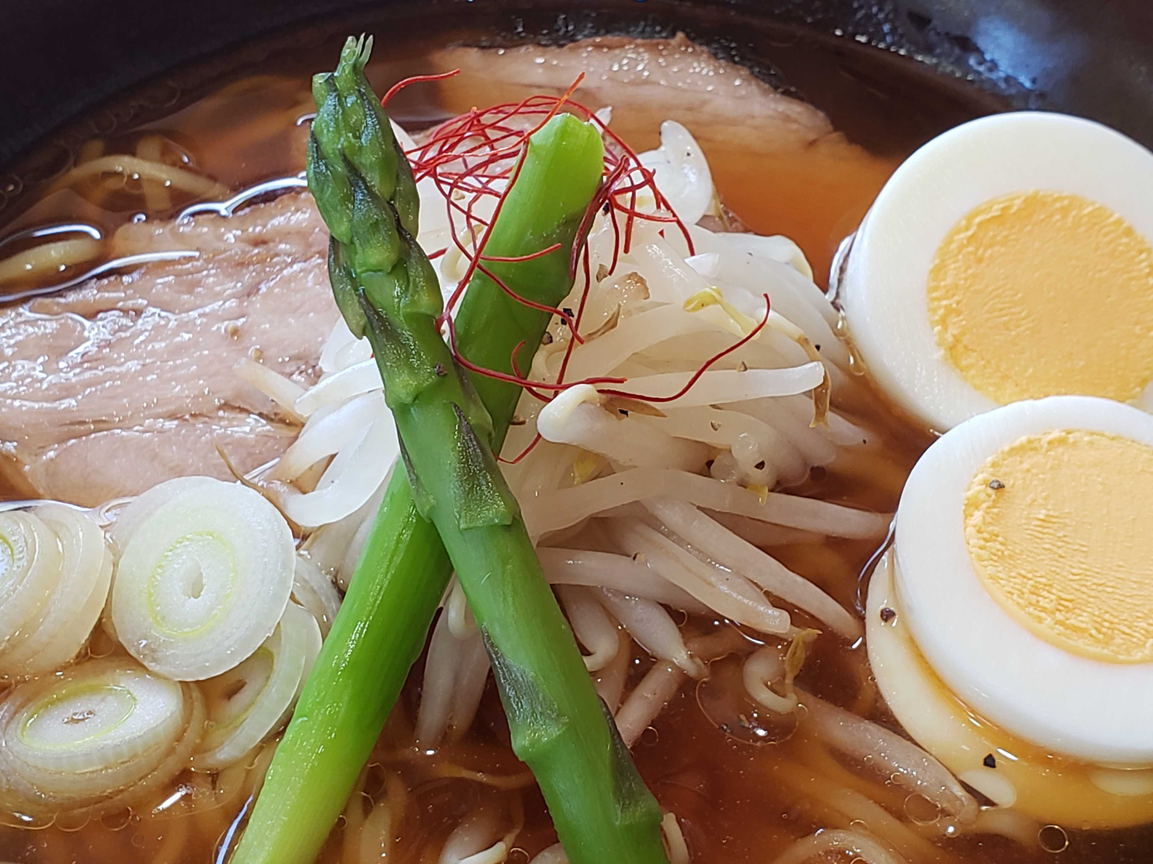 パピーが作った豚ロースのチャーシューとアスパラ、長ネギ、ゆで卵をトッピング、