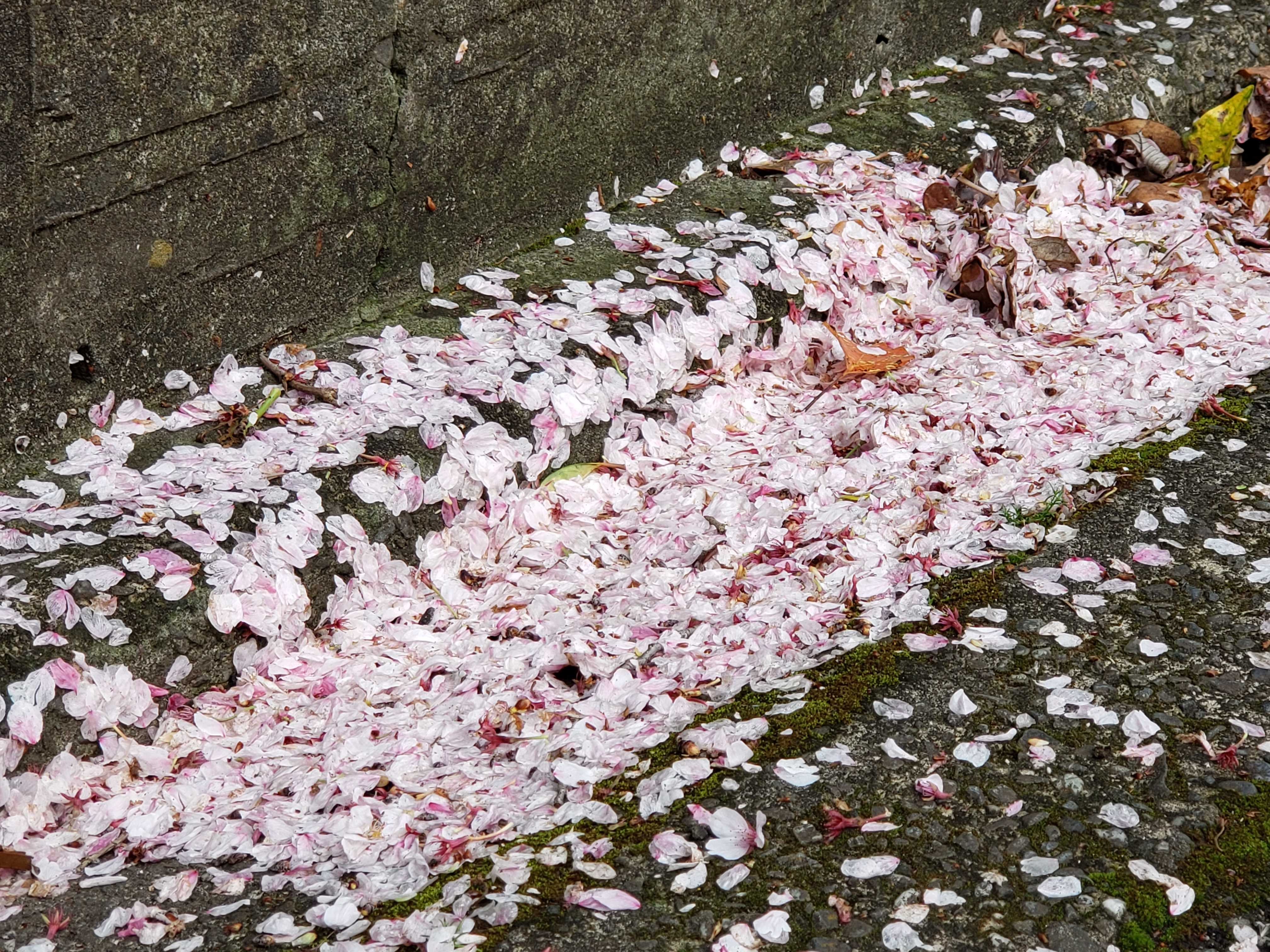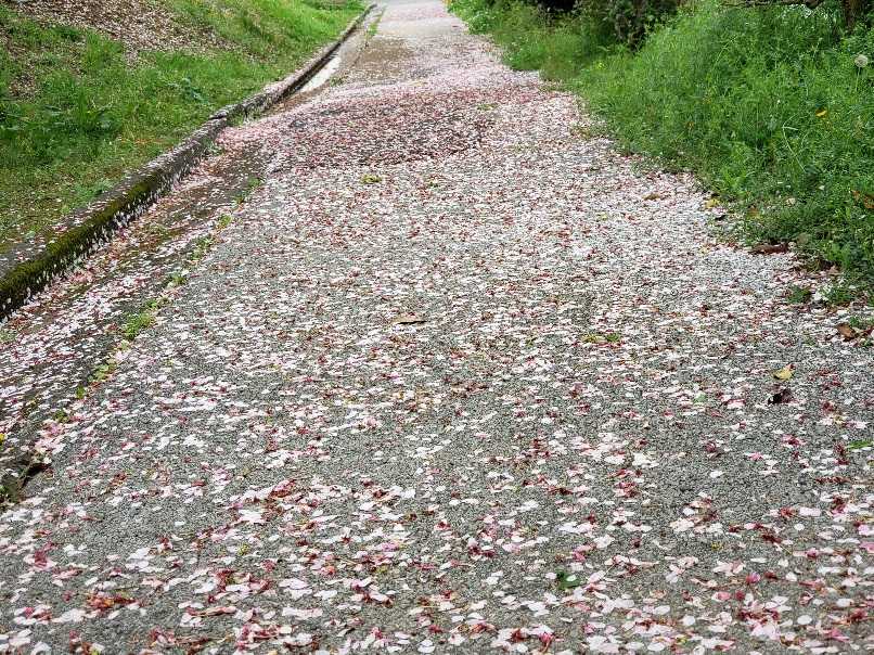 午前中の散歩に出ると桜の木のそばは雨で落ちた花びらがいっぱいびっくり