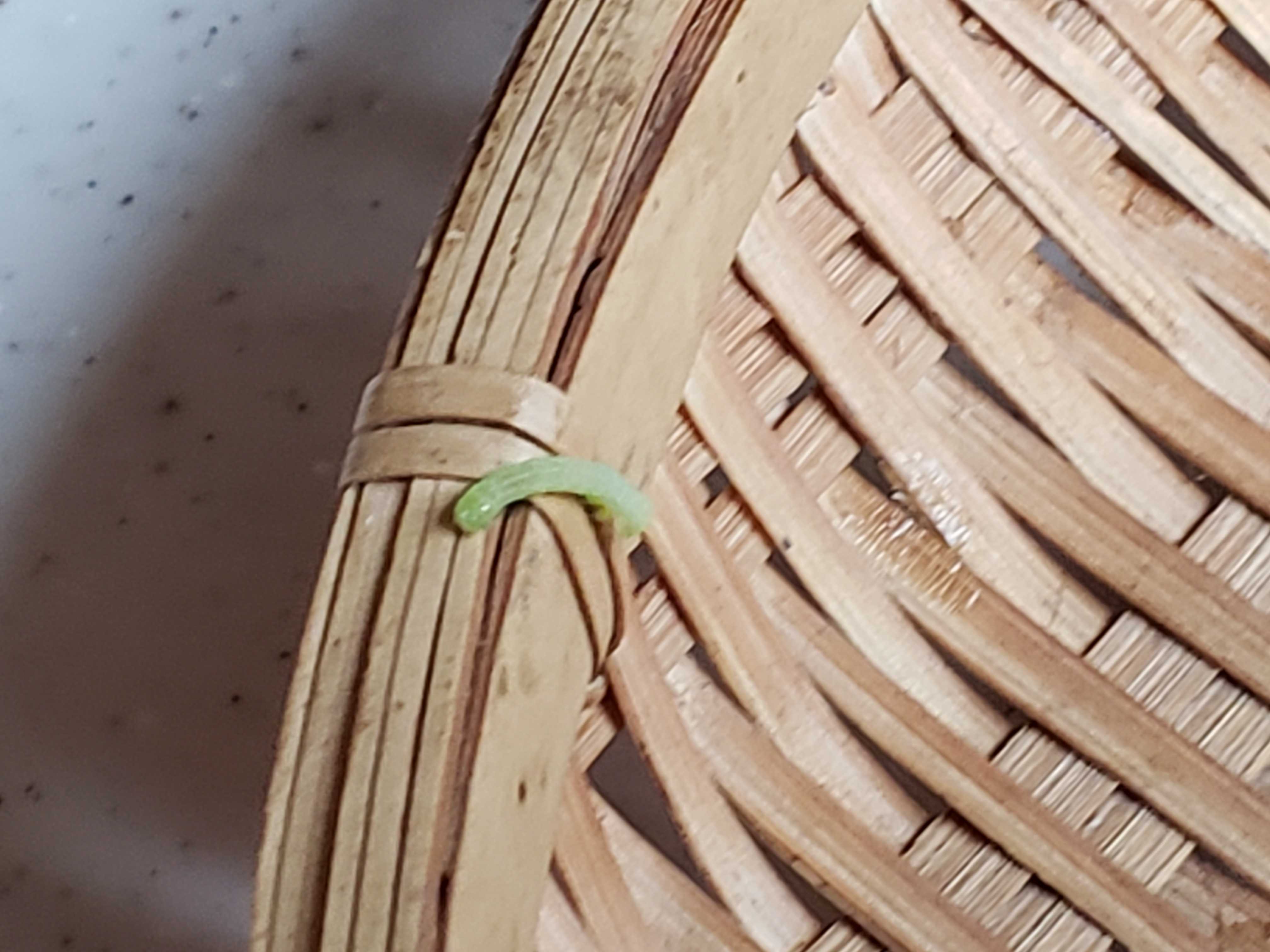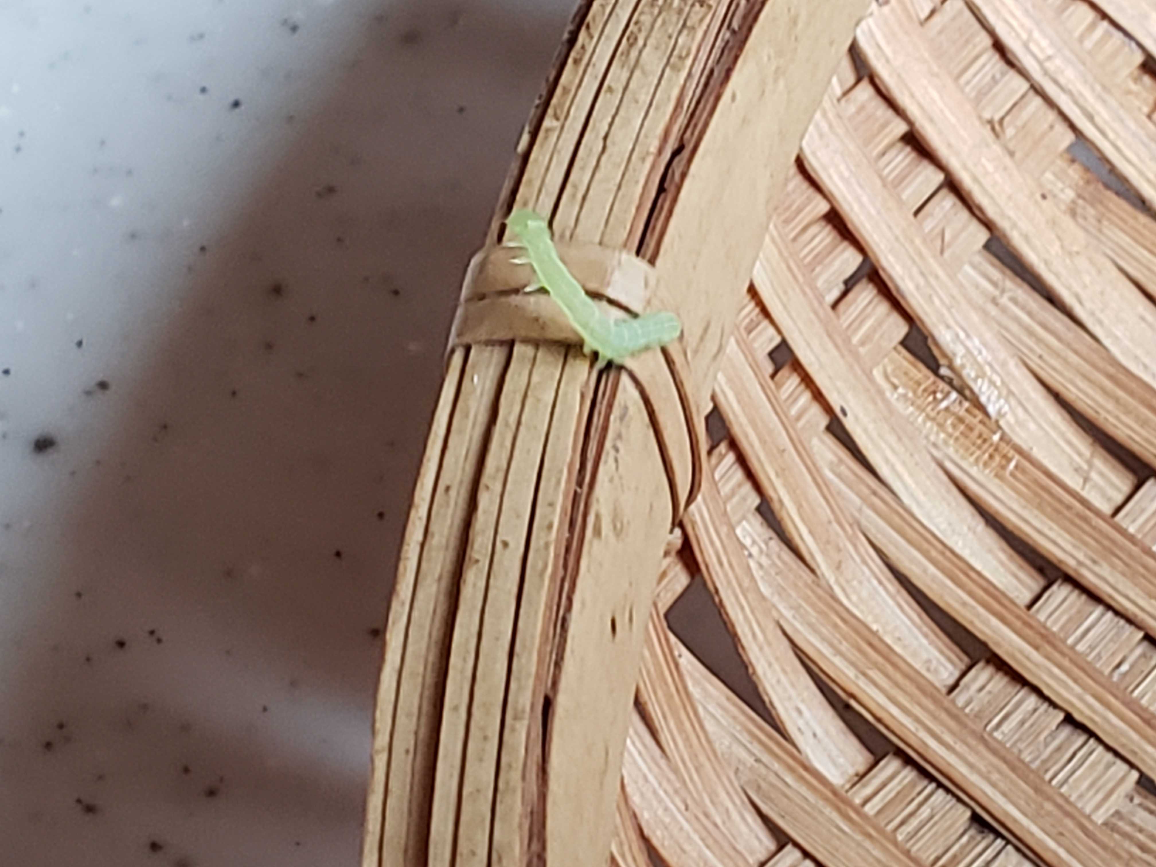 部屋に入れてしばらくするとザルの縁に尺取り虫が🐛