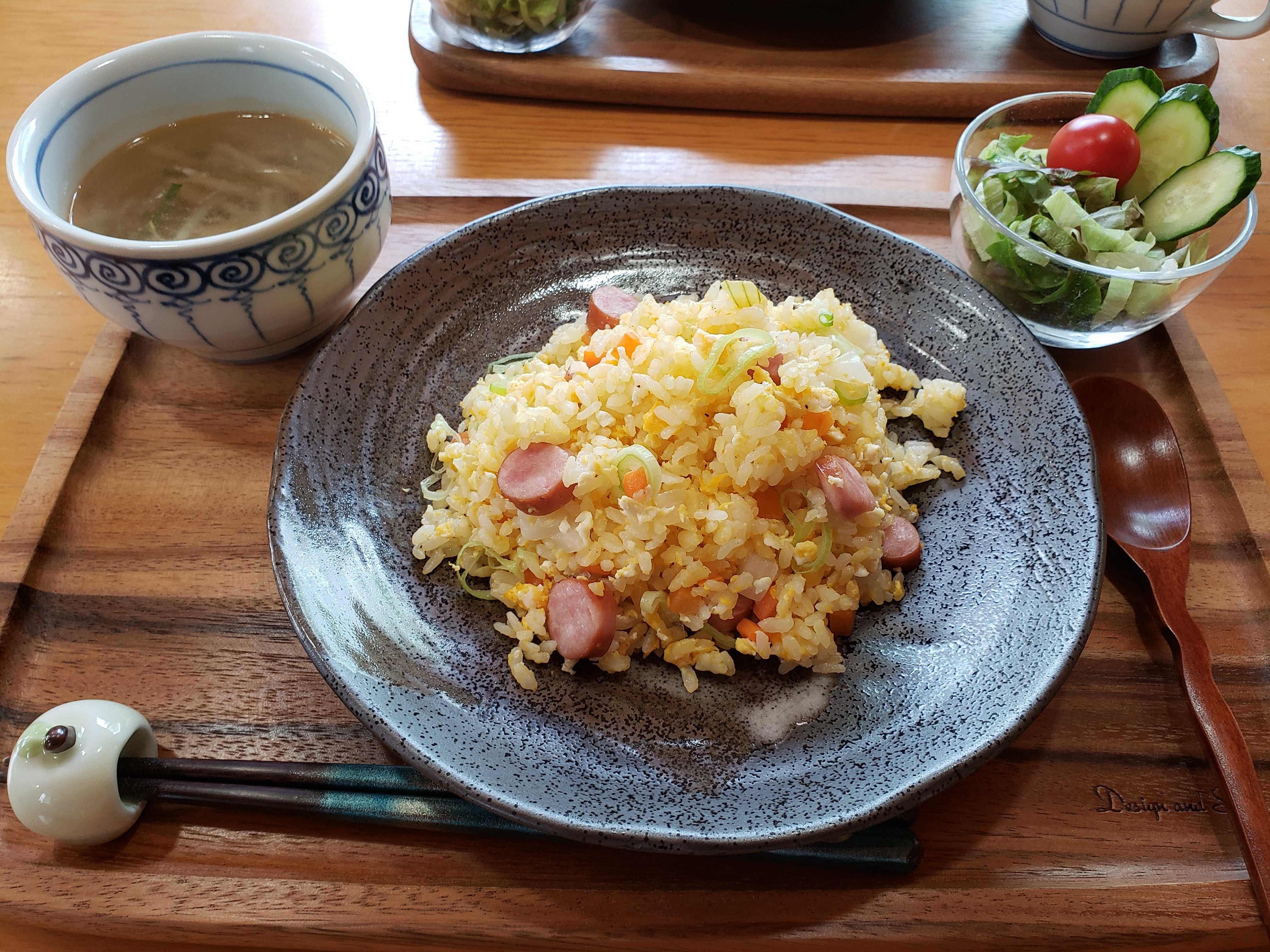 サラダ用の野菜を切り、中華スープを作り、そして炒飯を