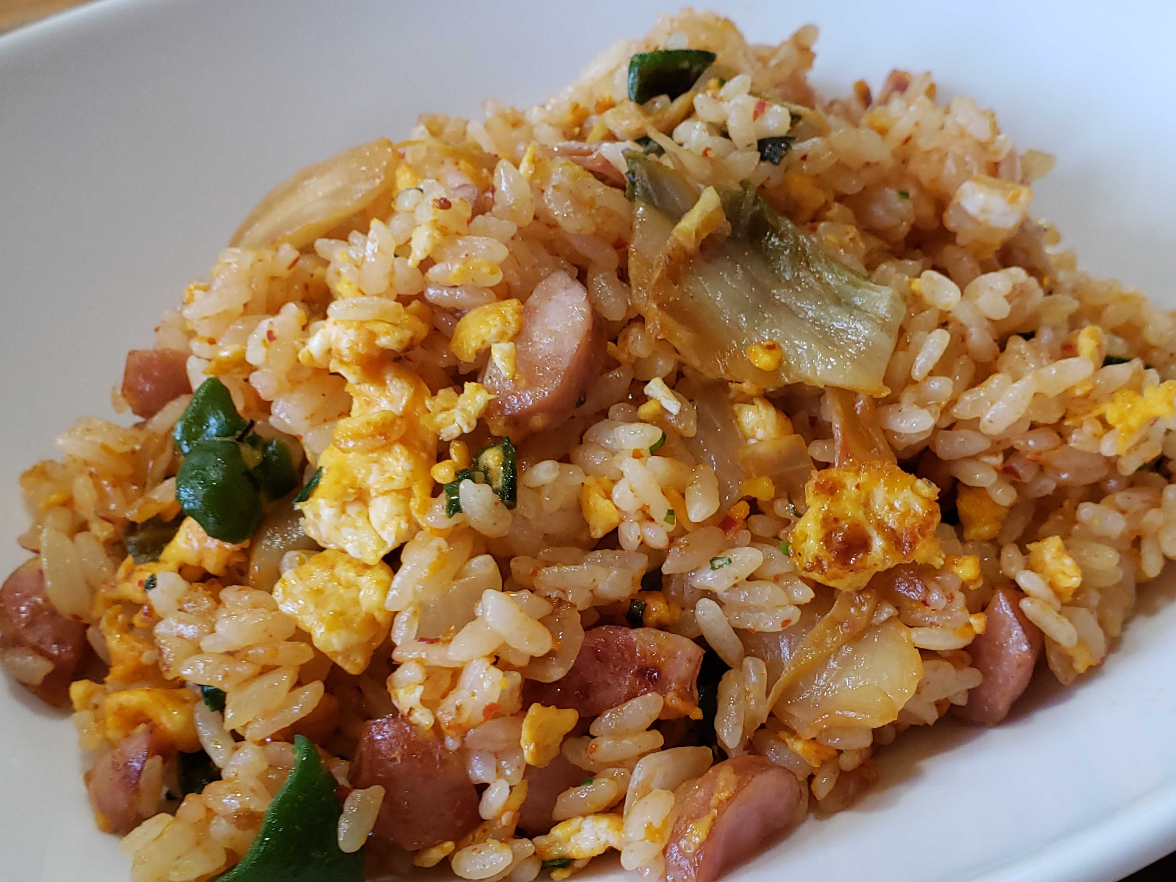 冷凍ご飯に残ってたキムチにウインナー、採れたてピーマンに玉ねぎを使用、