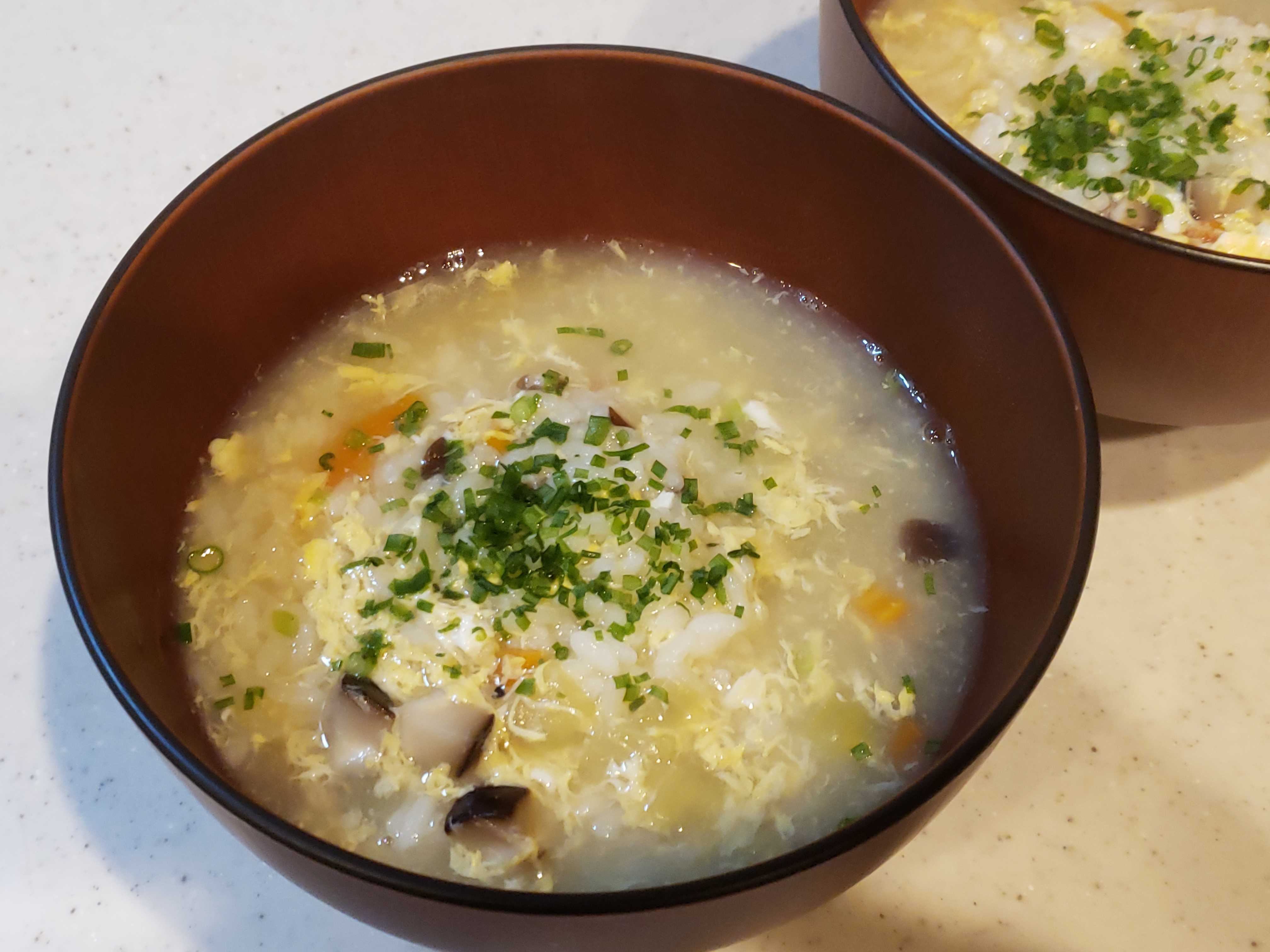 焼酎を飲みながら見てたんですがお腹が空きまして、鶏ガラ雑炊を作っちゃいました。