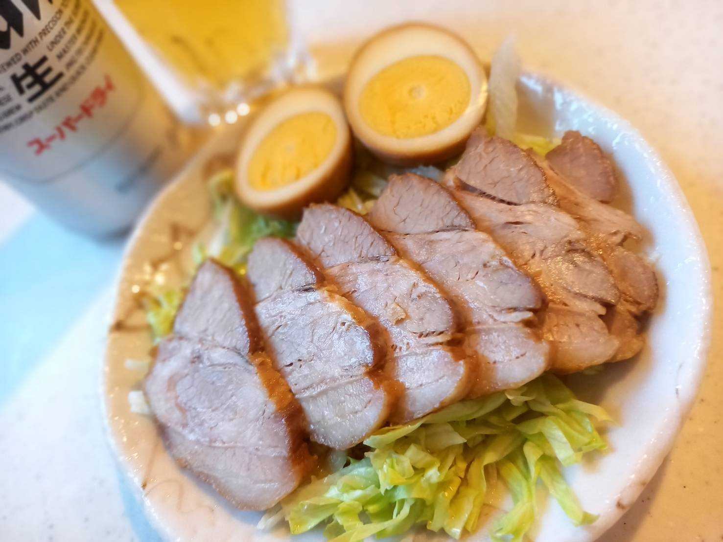 つまみは豚からロースのチャーシューと煮卵、この量を女房と半分こでした。