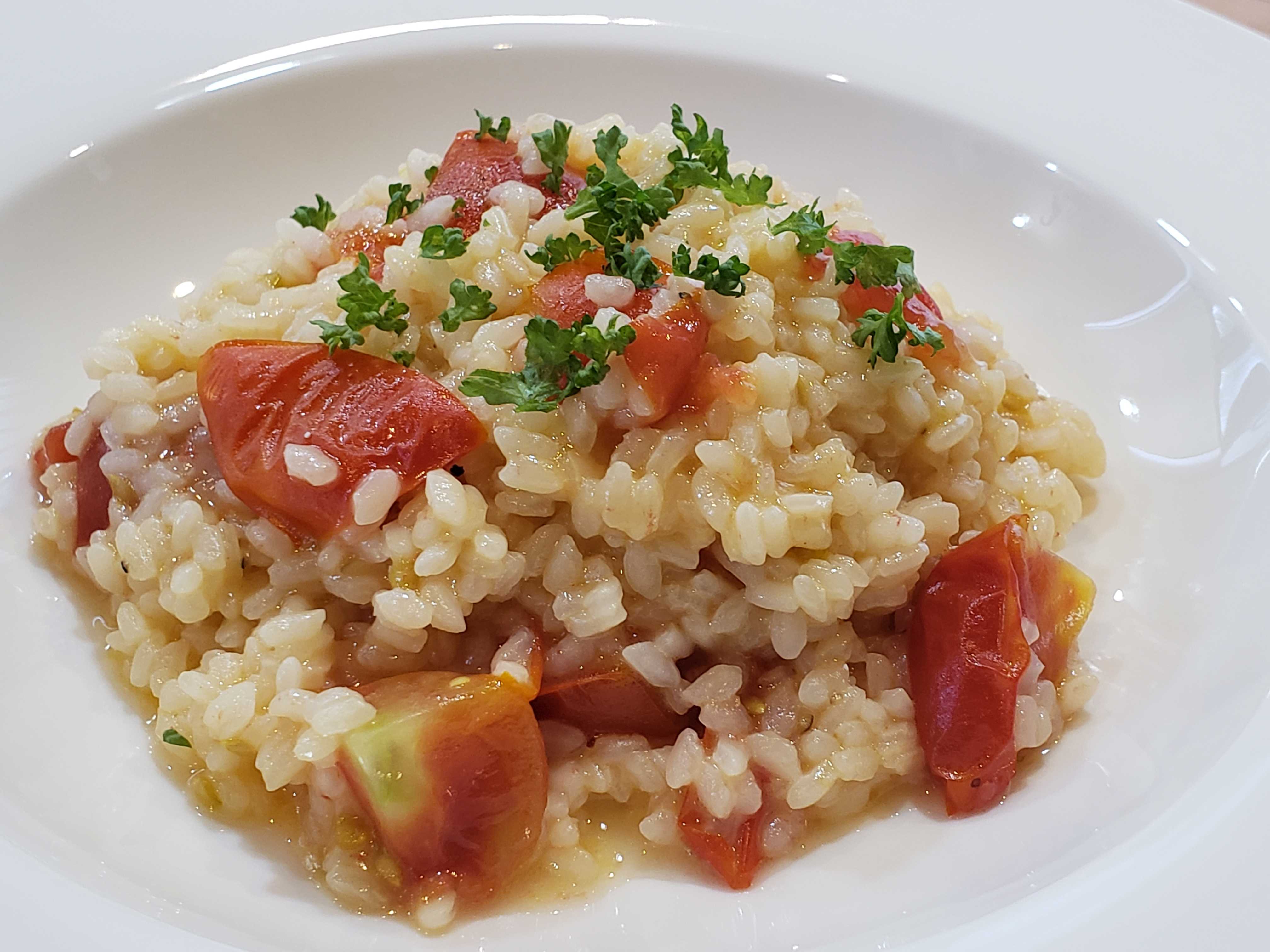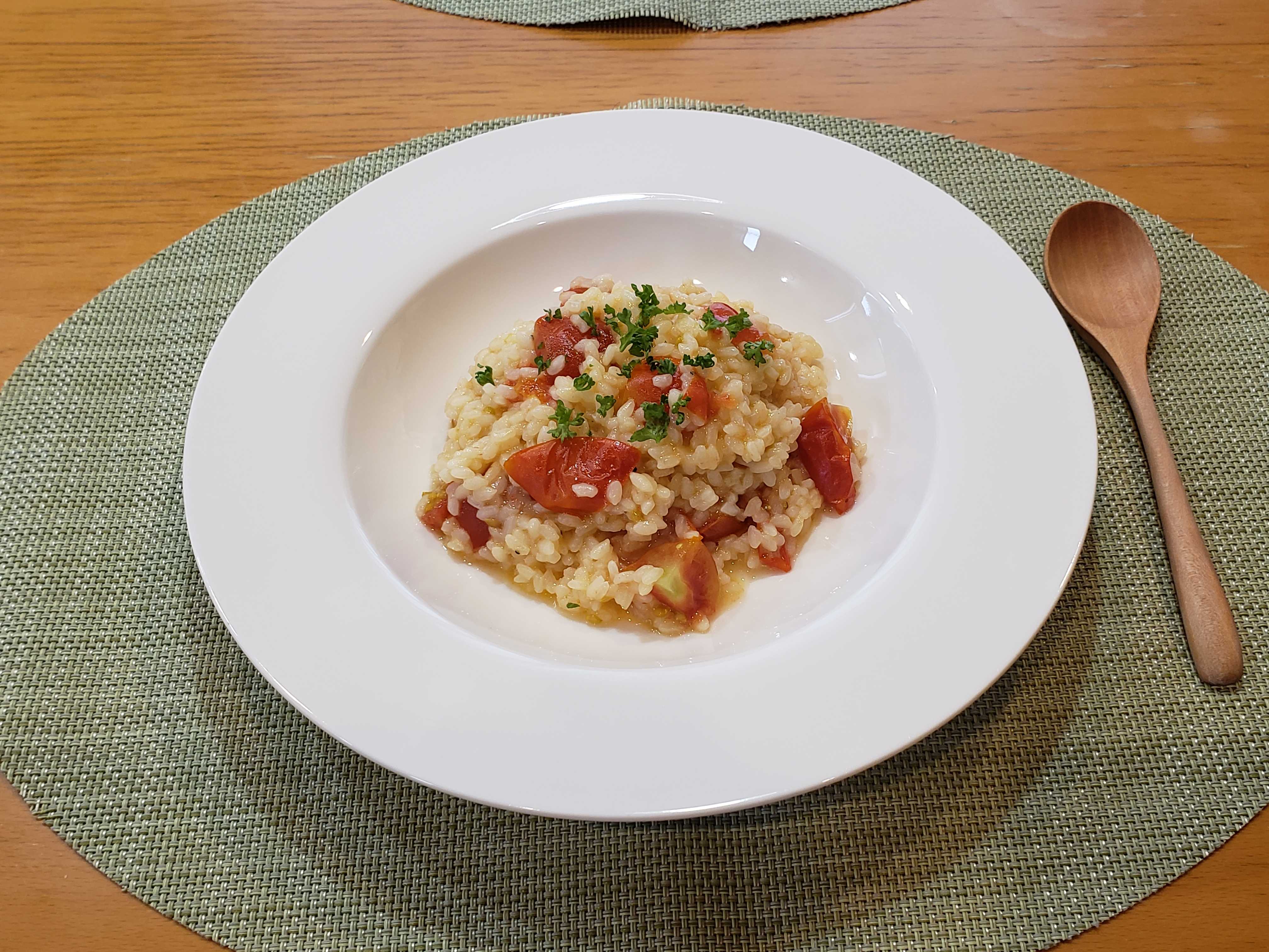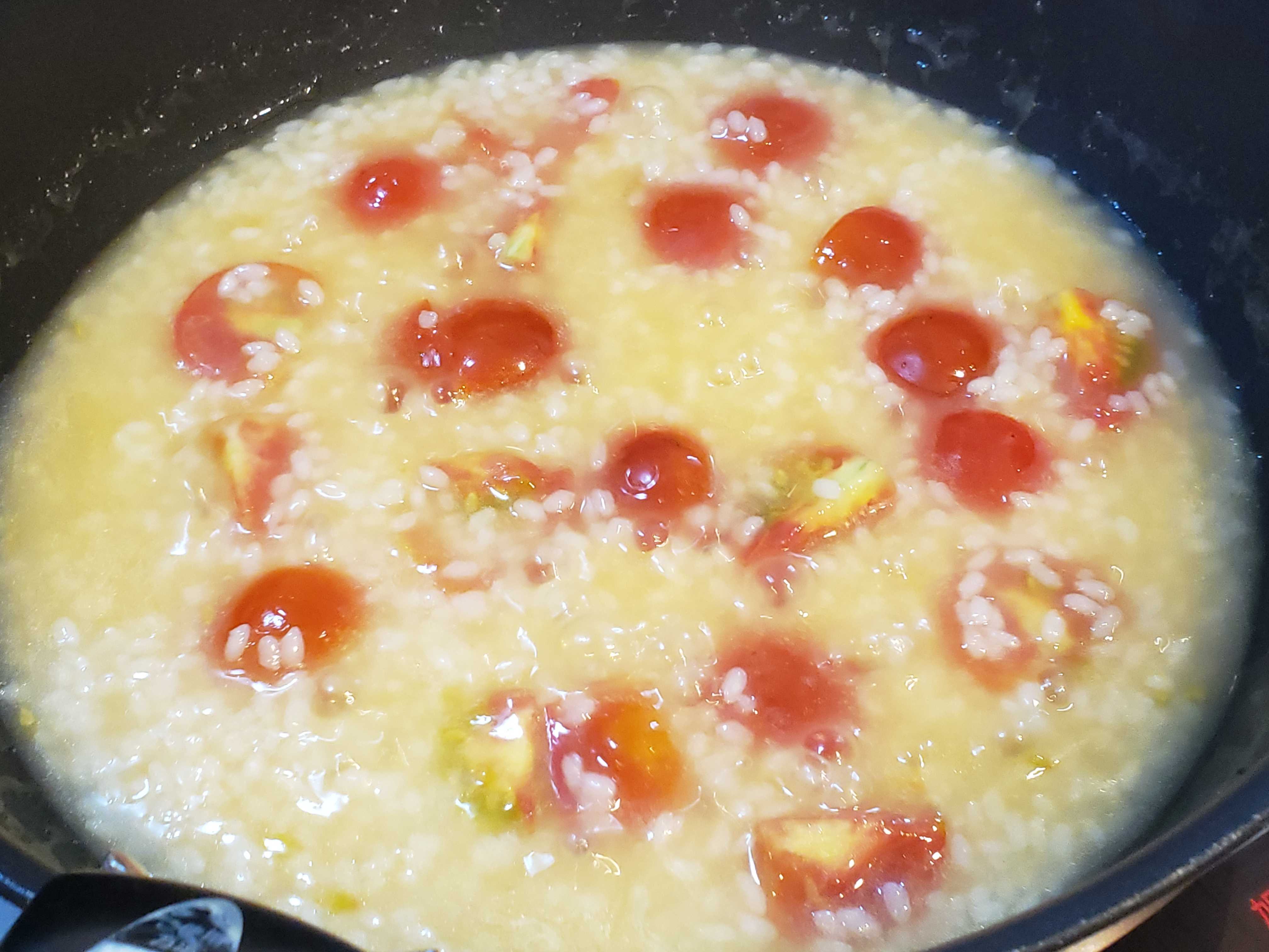 炊く時間は15分、ラスト5分になったらトマトを投入、