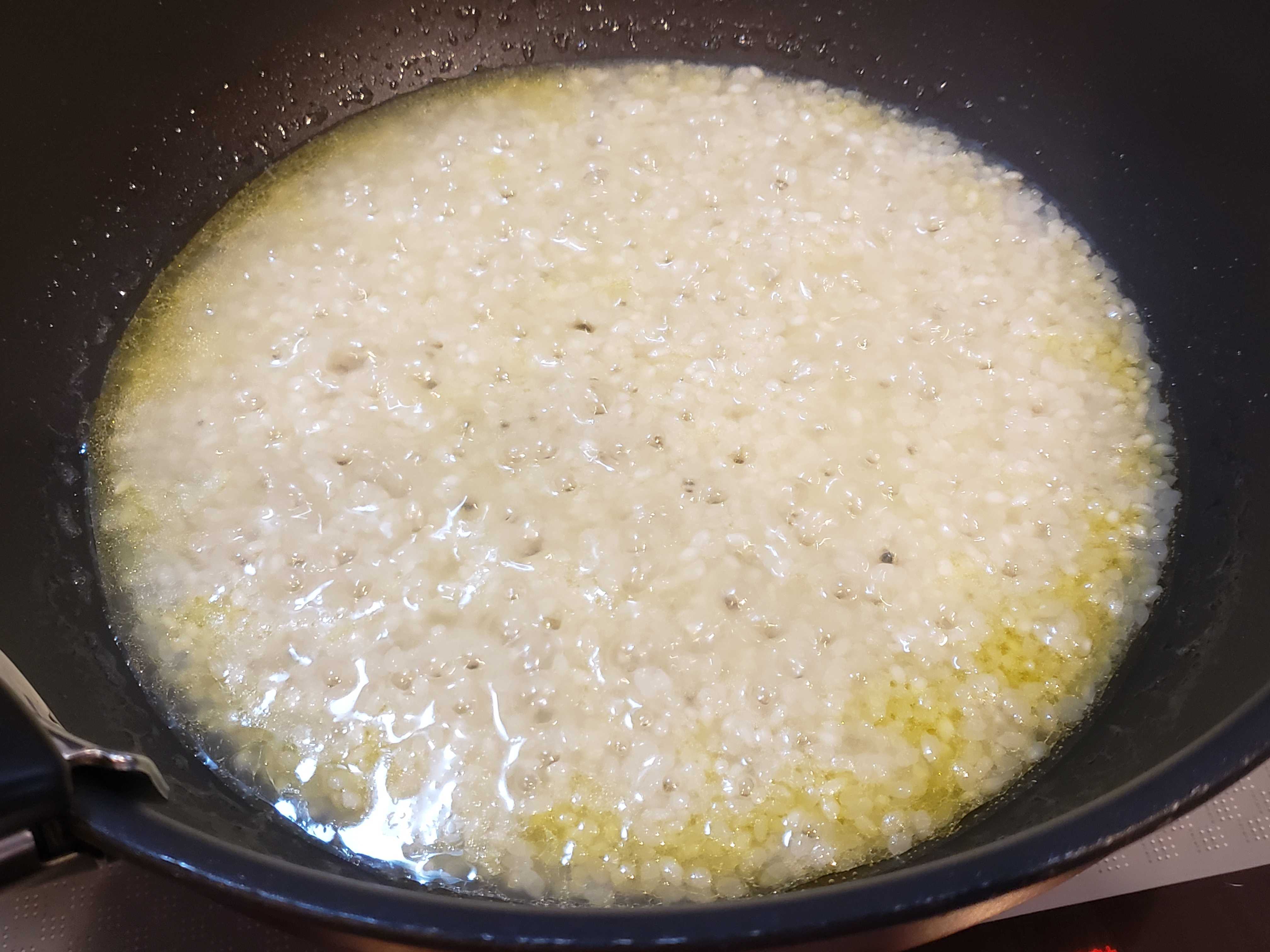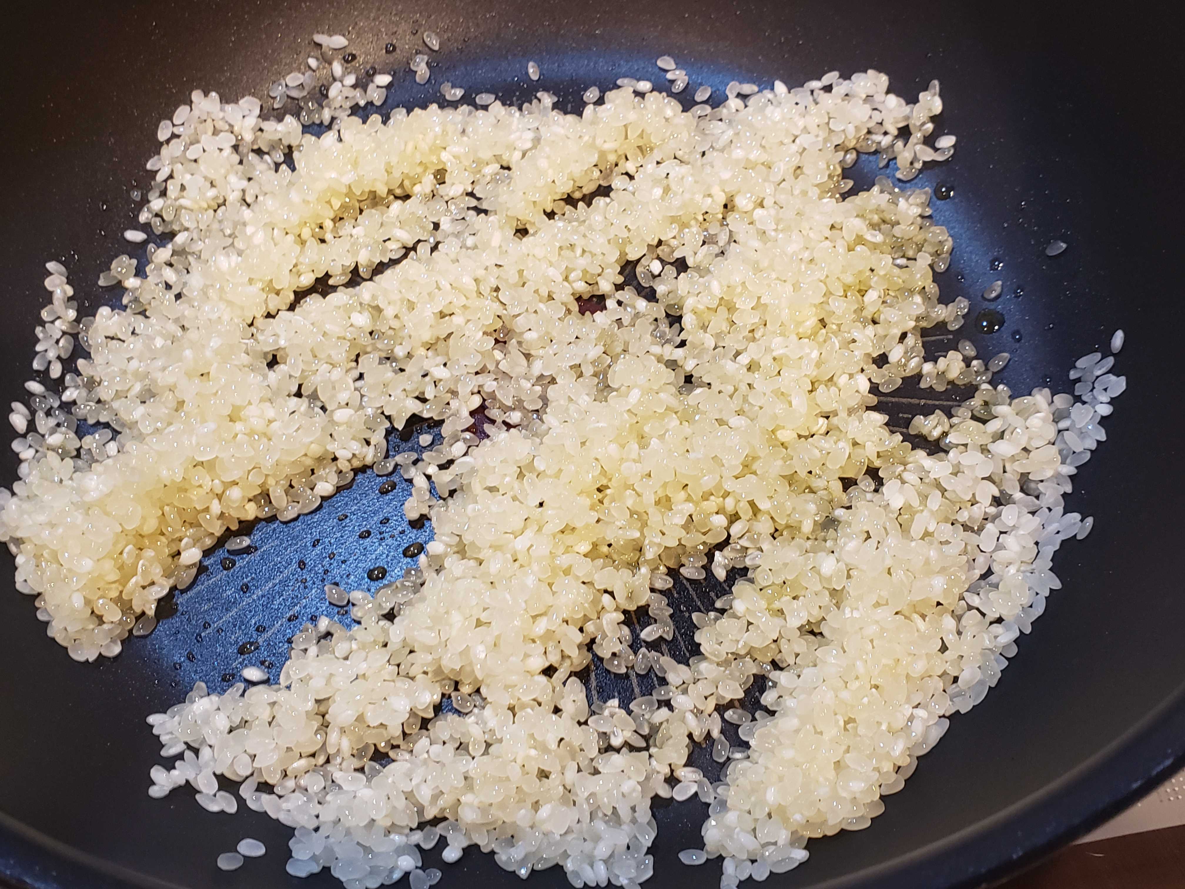 お米の色が透明っぽくなったら白ワインを入れてアルコールを飛ばし、