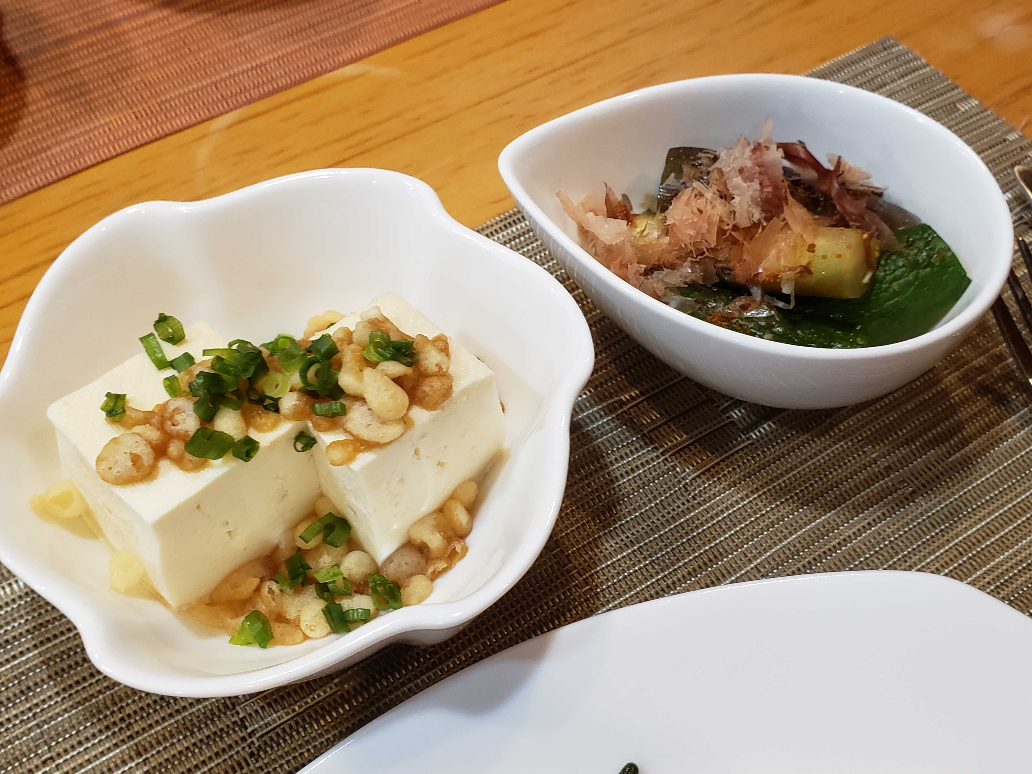 大盛のキャベツとレタスの上にスクランブルエッグ(白だし)とかまぼこ、オクラの煮浸し、