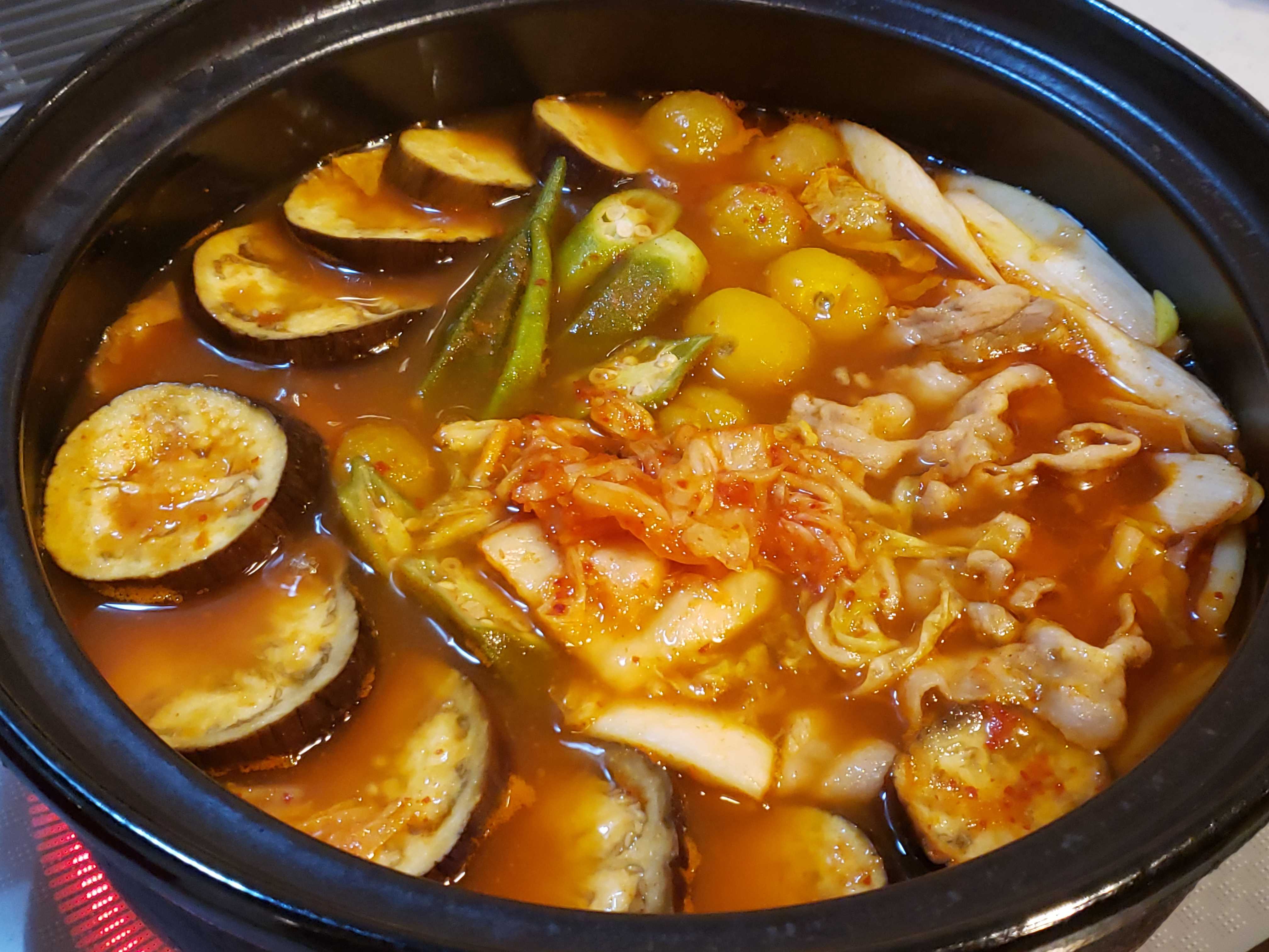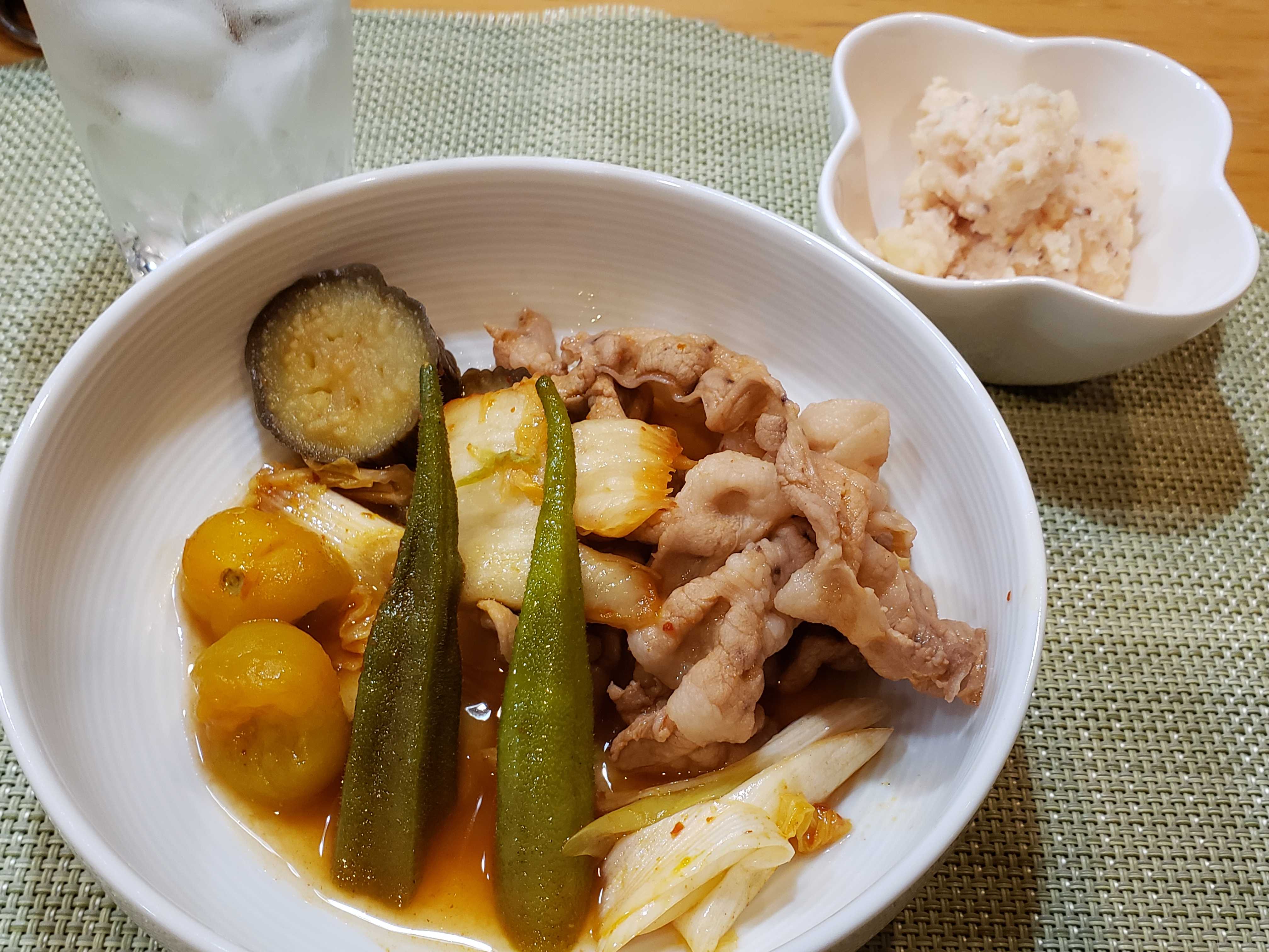 夕食は豚しゃぶ肉とある物野菜でキムチ鍋でした。