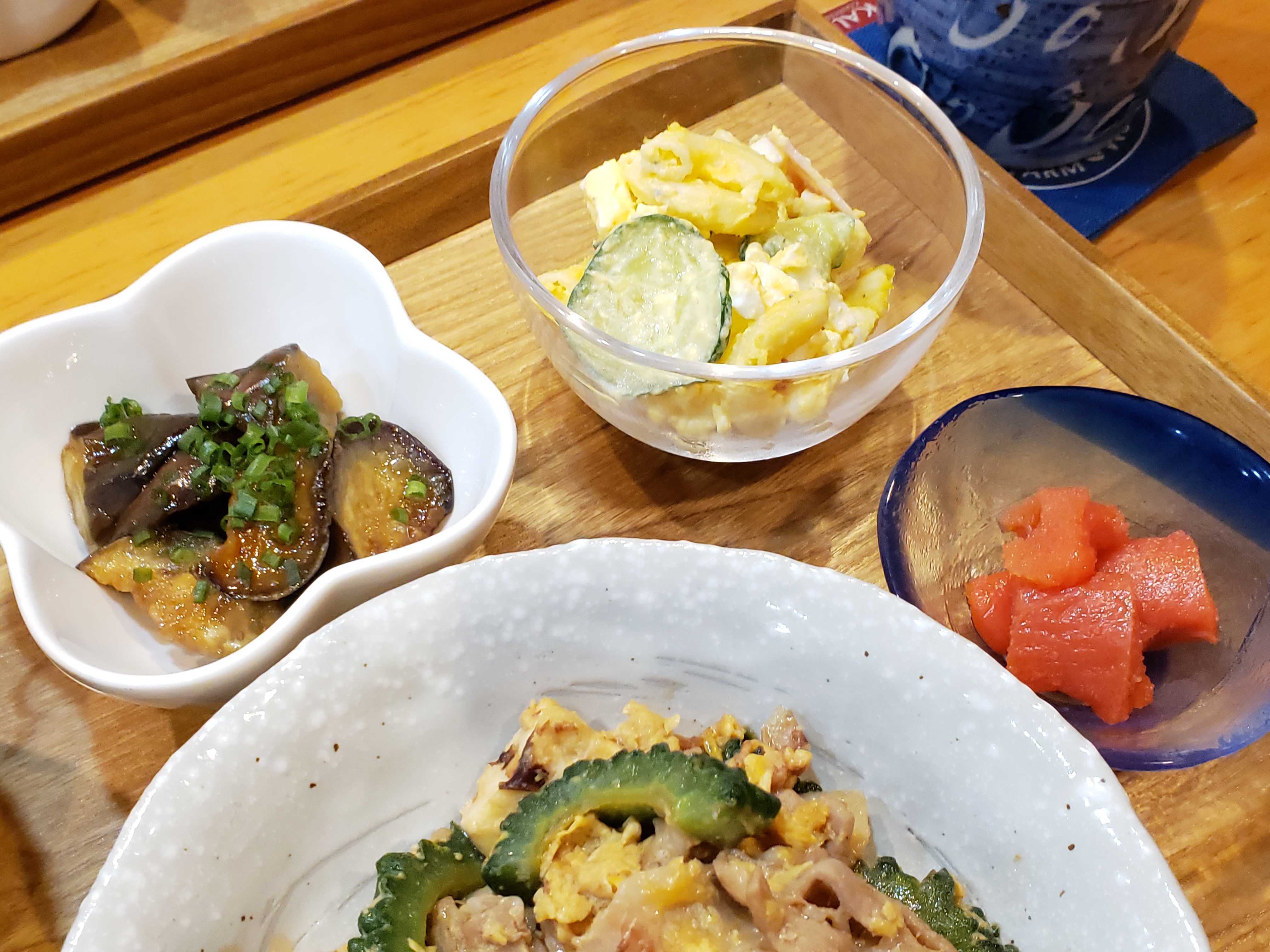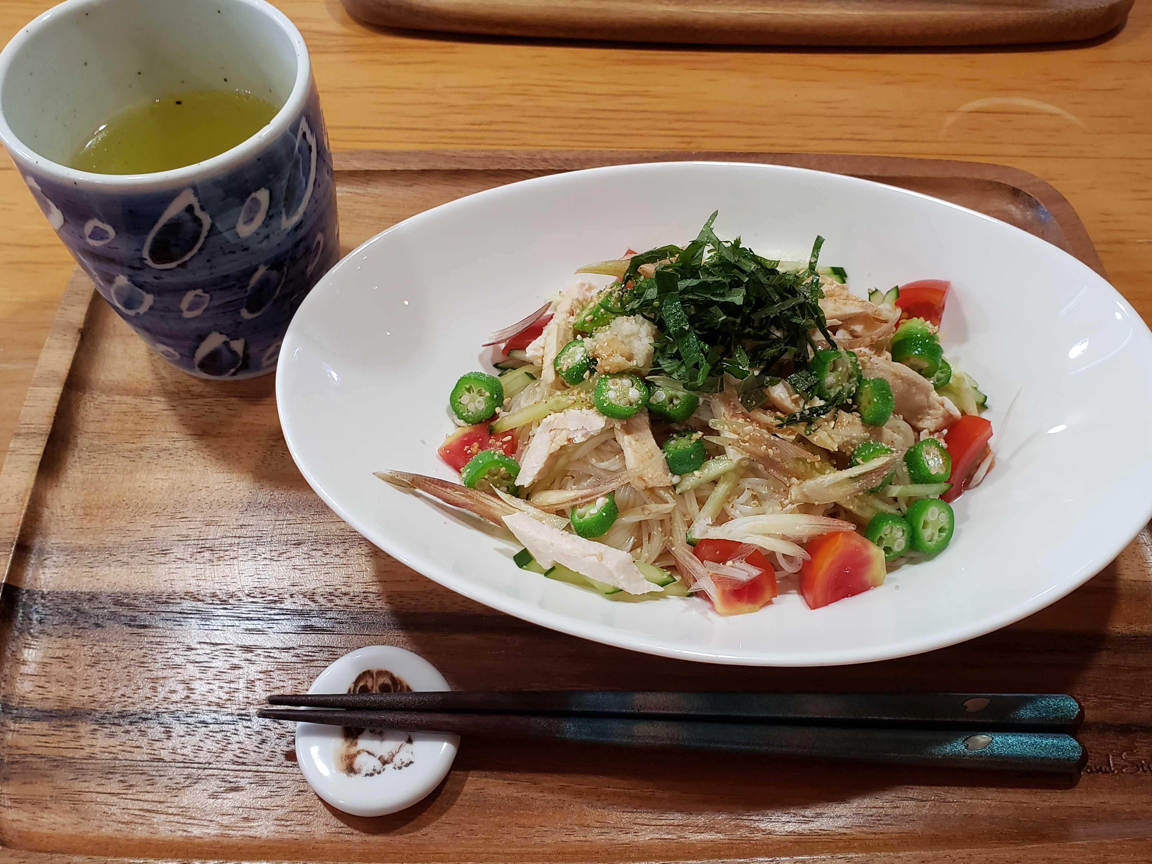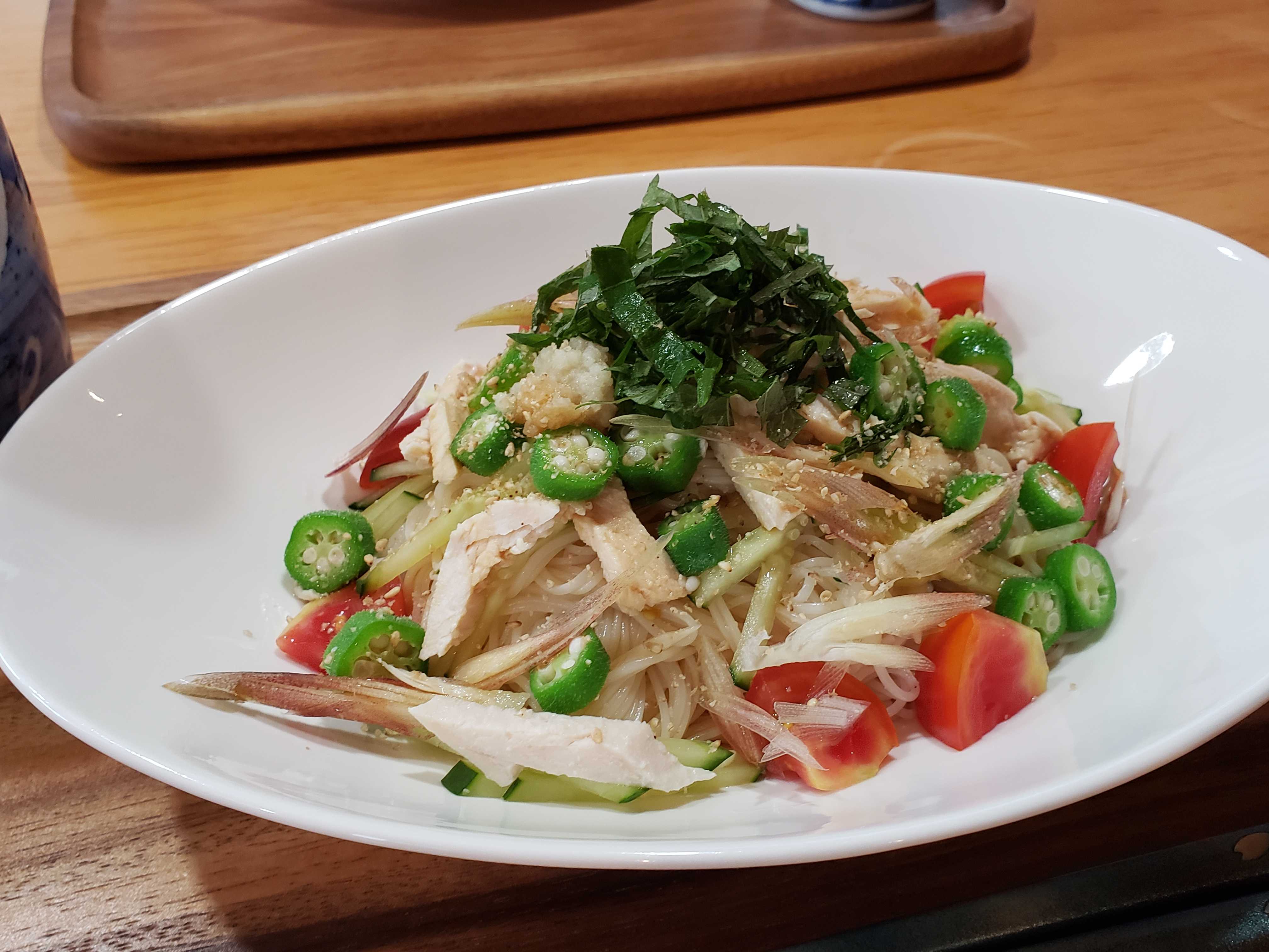 夏野菜もたっぷり、ツナの代わりに蒸し鶏をトッピングでした。