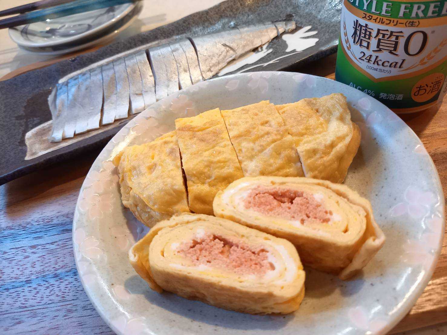 しめ鯖とたらこ入りの卵焼きで乾杯