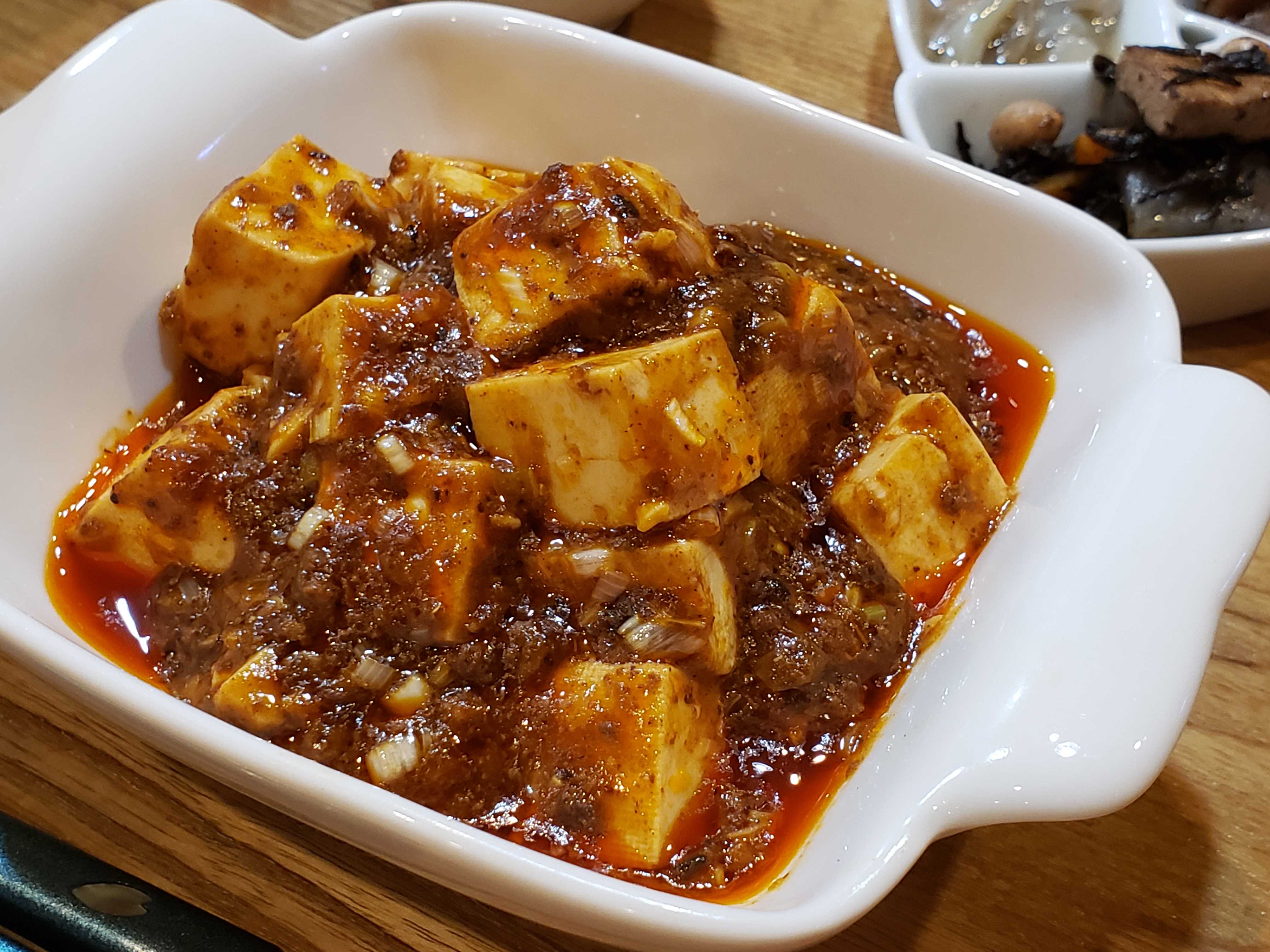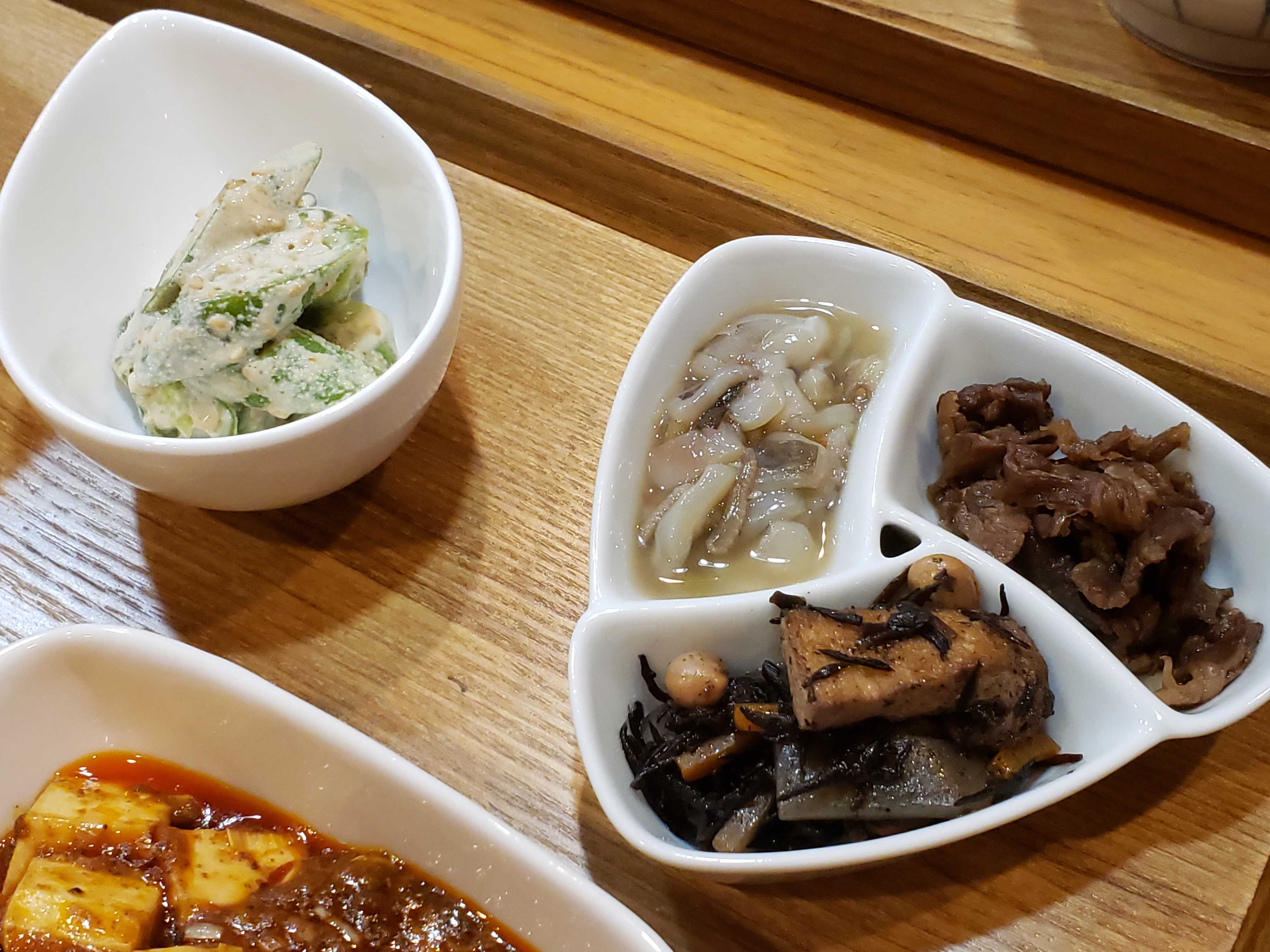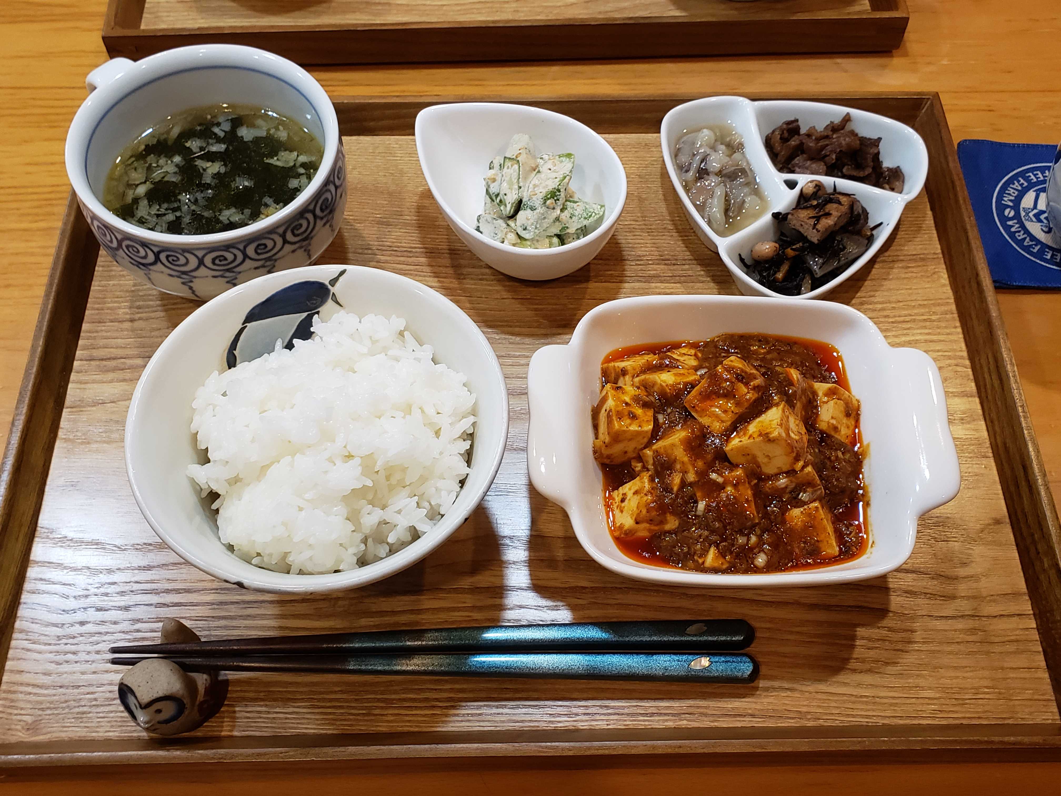 麻婆豆腐に3品盛り、ご飯もも美味しいですね。