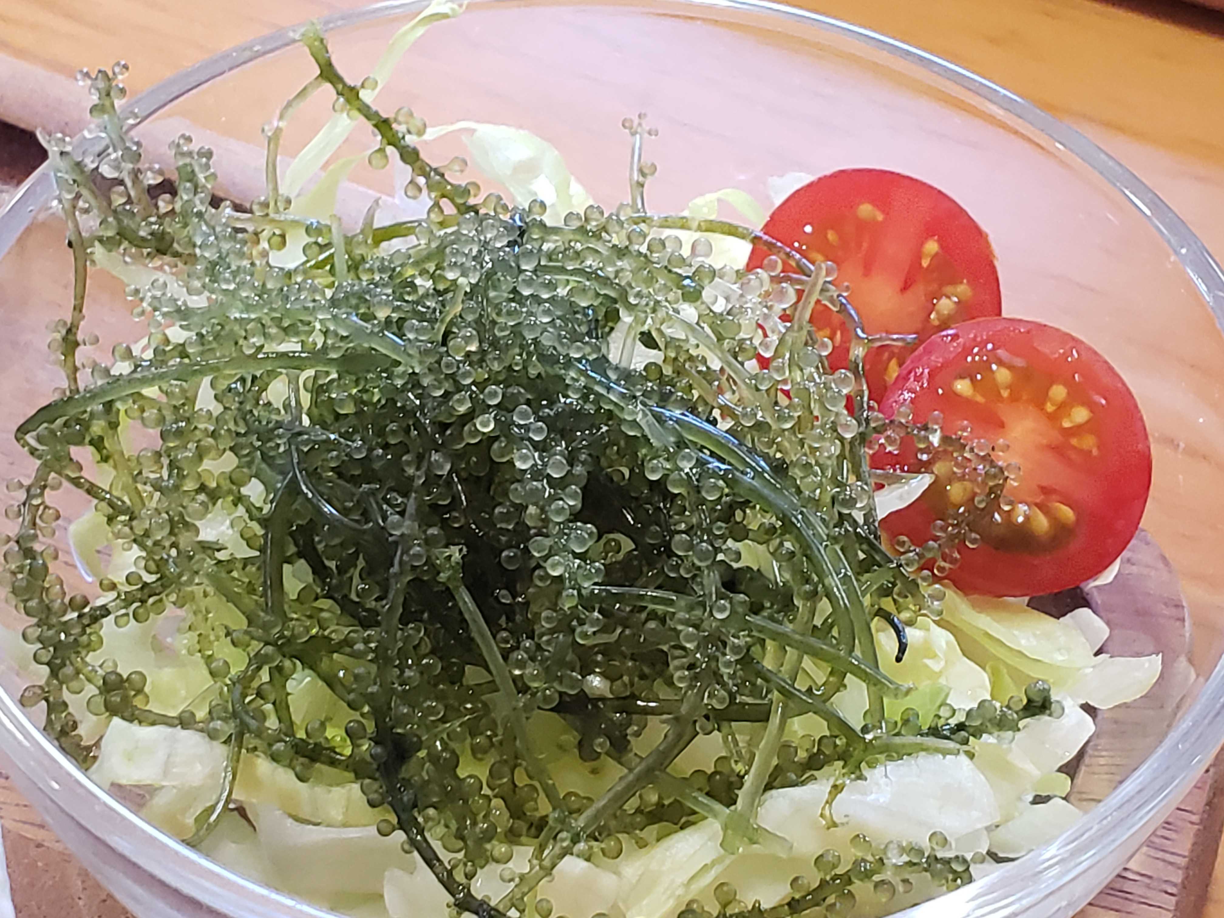 ドレッシング等をかけておき過ぎると海ブドウのプツプツ感が無くなりますよ。