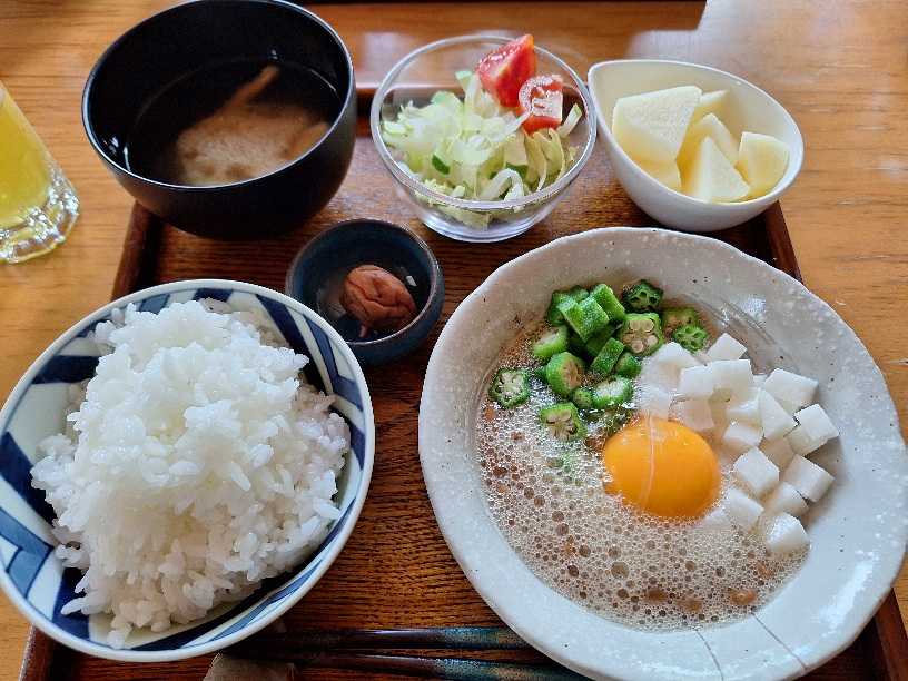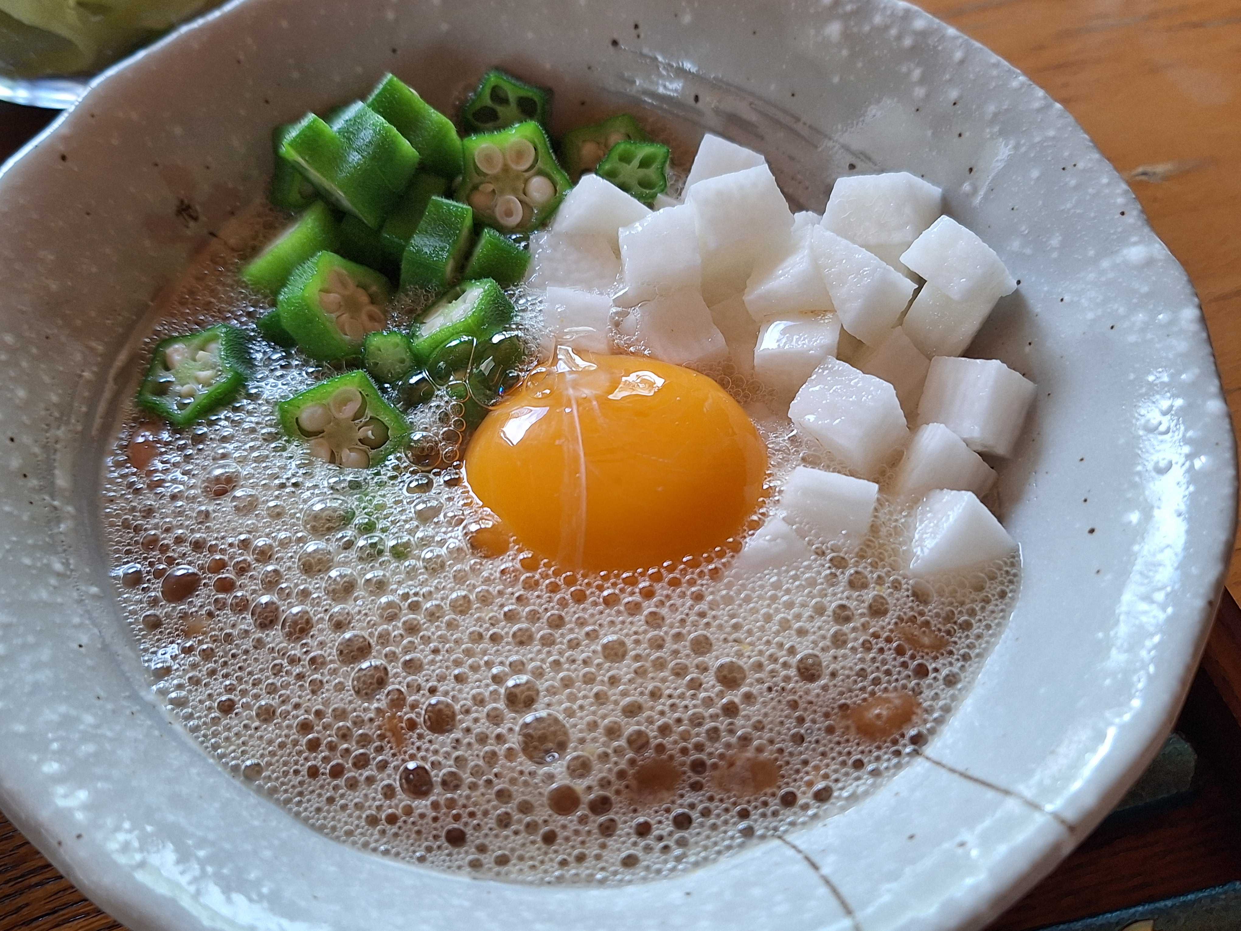 三色(納豆 オクラ 長芋)に卵黄をプラス、