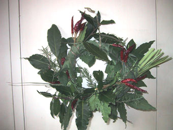 レモングラスを輪にして、ローリエ(月桂樹)とローズマリーをあわせ、赤唐辛子を彩りにして出来上がり!!。
