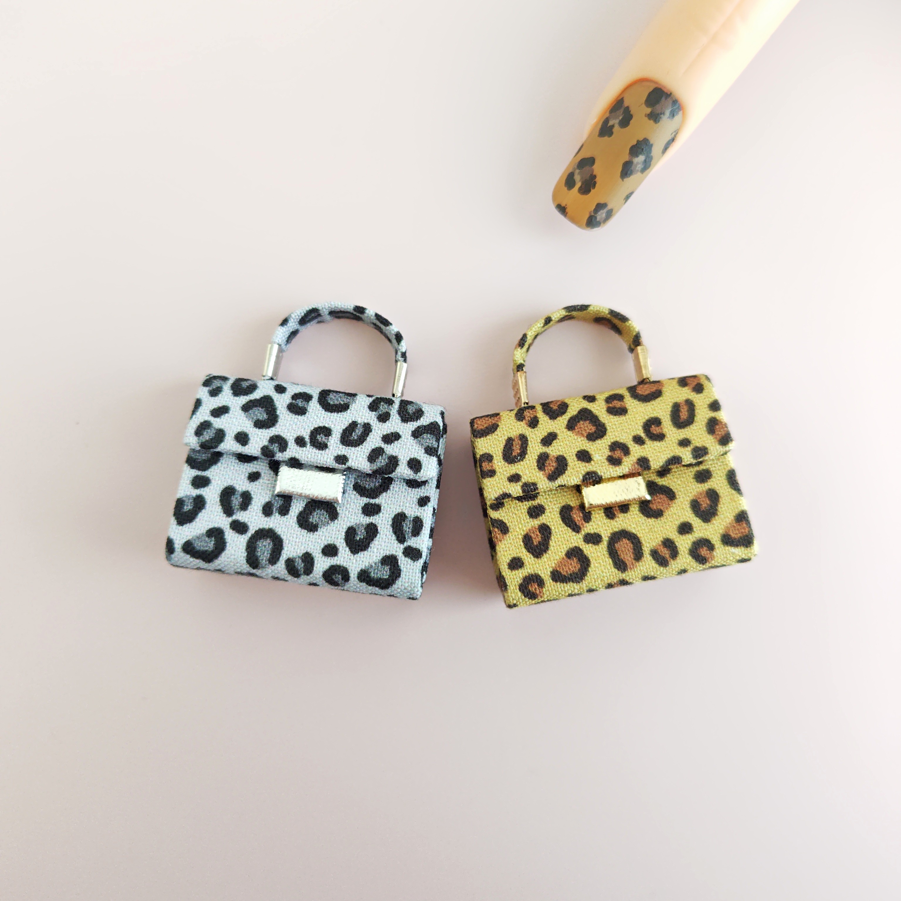 小さいレオパード柄の生地をみつけたのでミニチュアバッグを作りました。グレーと、黄色味が強いブラウンです。トルソーは22cmドールのボディと同サイズです。